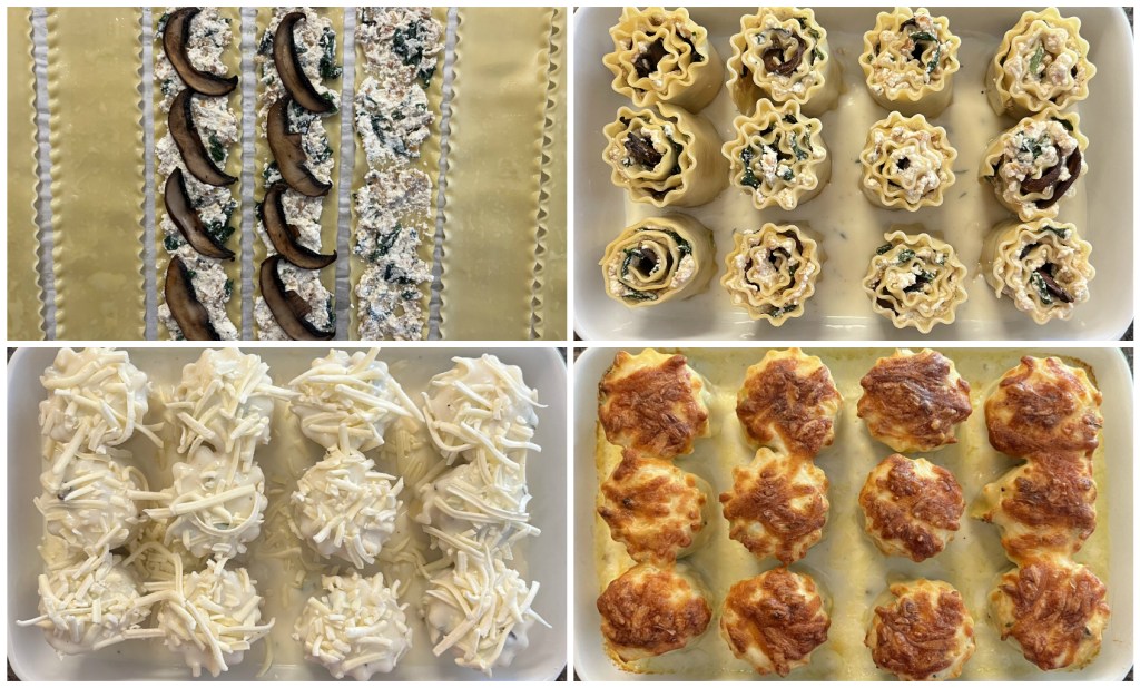 - As show in the upper left photo above, spread a thin layer (about 2 tablespoons) of the ricotta and spinach mixture over each of the cooked lasagne noodles, dividing the mixture evenly among the noodles. Lay the Portobello slices on top of the noodles, in a single layer (again, divide them evenly among the noodles).