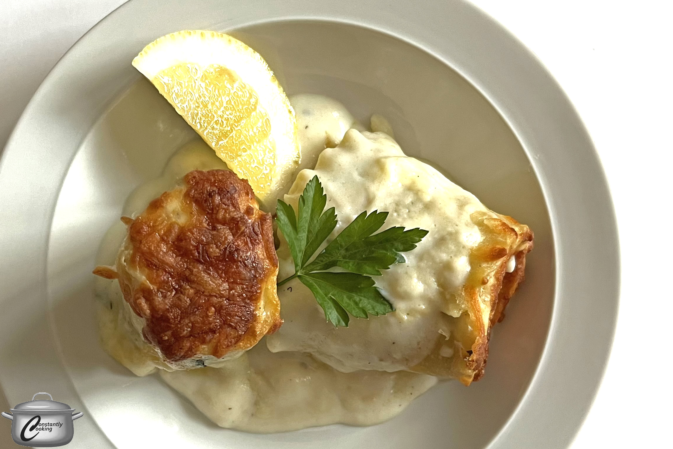 - Carefully roll each noodle up, one at a time, then place them frilly side up (not seam side down) in the prepared baking dish. Ladle remaining Béchamel sauce over the rolls, drizzling into the centre layers as best as you can and coating the outside of each roll with sauce. Sprinkle mozzarella evenly over the rolls.