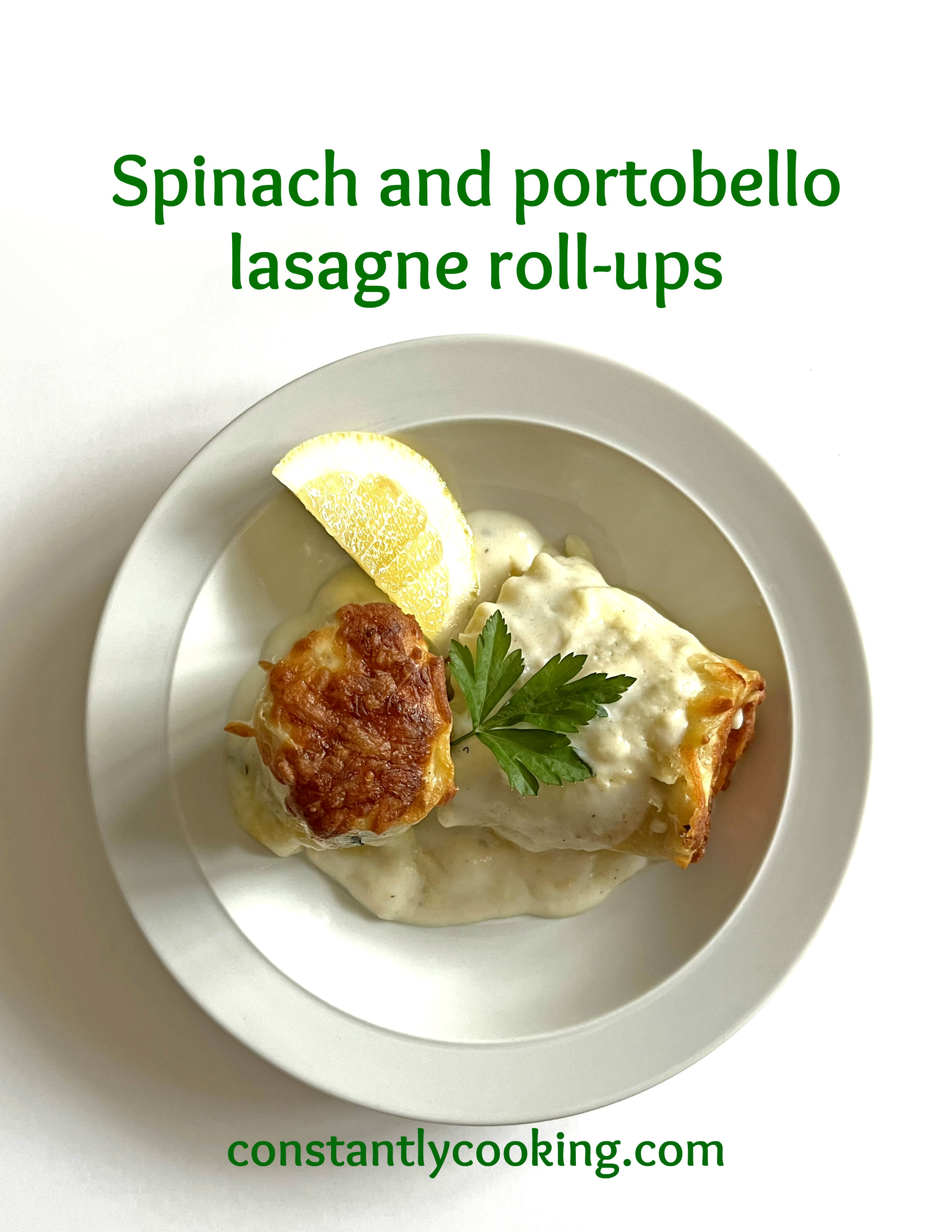 I love making lasagne when I have a crowd (small or large) to feed but I do find that sometimes serving them prettily can be a challenge. This recipe was inspired by my desire to create a new format that comes out of the pan in attractive (and delicious) portions and I’m very pleased by how it turned out. You could easily follow this same technique with a more traditional meat and tomato sauce lasagne, but I’m happy to offer this vegetarian version as a starting point.