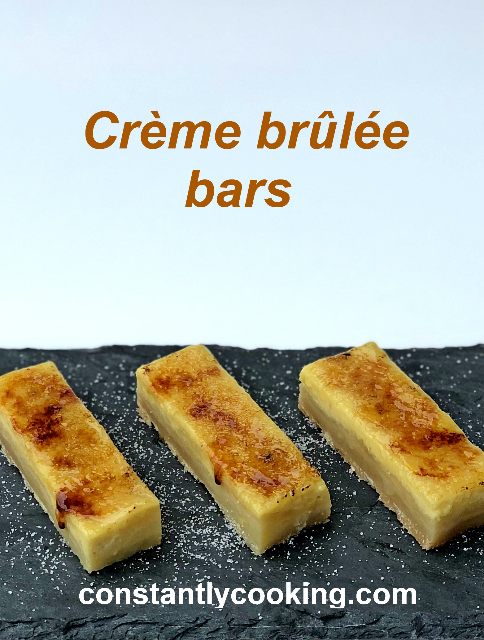 - For bars, cut into 6 rows by 3 rows (each bar should measure 1 1/2 x 3 inches or 3.75 x 7.5 cm). Place bars, slightly separated, on a metal baking tray. Sprinkle the remaining 1/4 cup sugar evenly over the bars then scorch the sugar with a torch (or use your oven’s broiler).