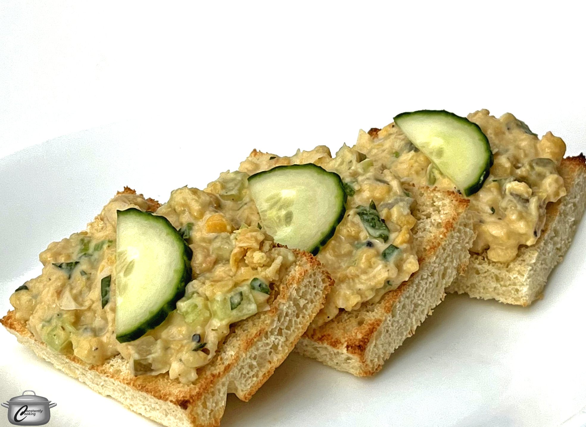A friend who knows I am a lifelong lover of tuna salad challenged me to make a tasty vegan version of my favourite sandwich, thinking I might have a hard time coming up with an alternative. The answer was easy: mashed chickpeas make a fantastic sandwich filling, especially when you add in plenty of flavourful ingredients. This mixture is equally delicious served in cute little lettuce cups or can be spooned over a bowlful of your favourite greens plus it makes a fantastic dip for chips or cut vegetables. If you’re looking for more tasty ways to enjoy chickpeas, check out this handy recipe roundup.
