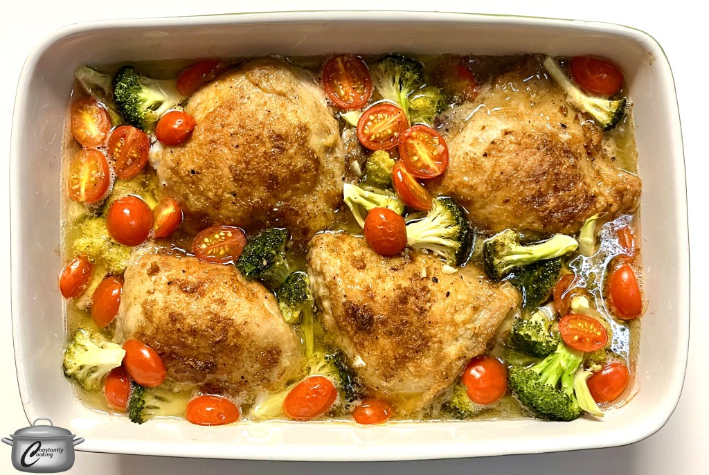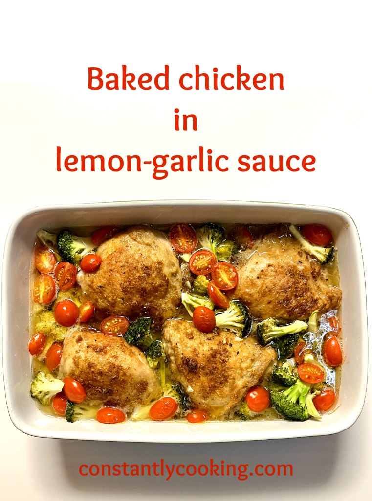 • Once all the chicken has been fried, drizzle the lemon-garlic sauce around the chicken pieces in the baking dish and then sprinkle the onion pieces and tomatoes over top. Use your fingers or a fork to tuck the onions, tomatoes and broccoli down into the liquid. Add just enough white wine or water to bring the liquid level to three-quarters of the way up the sides of the chicken pieces.