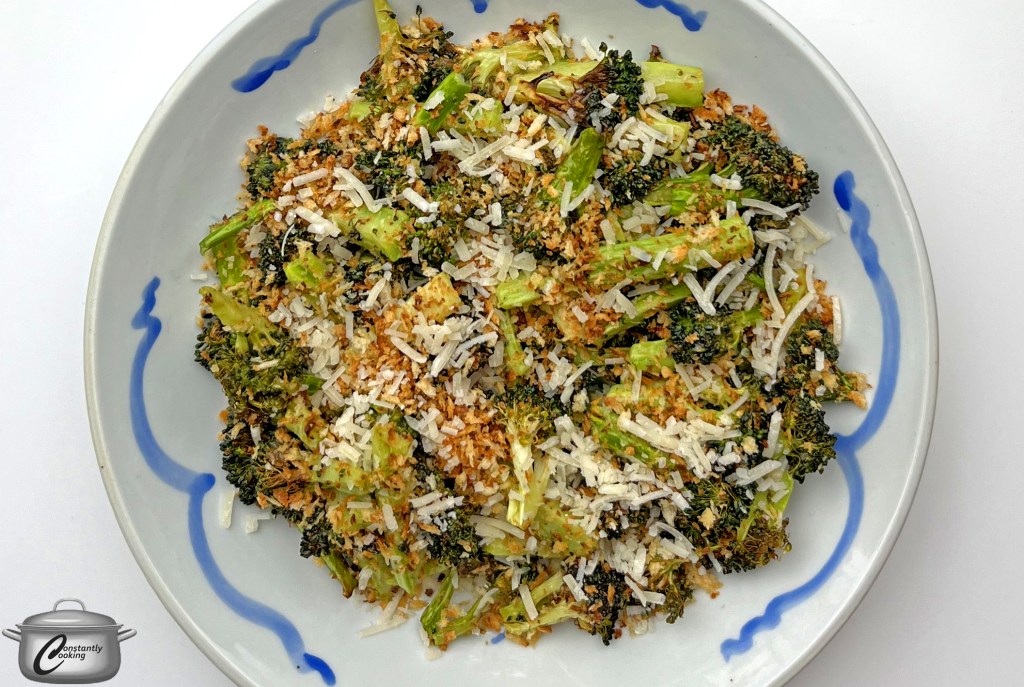 - Sprinkle toasted panko evenly over broccoli then scatter grated parmesan over top. Serve hot.