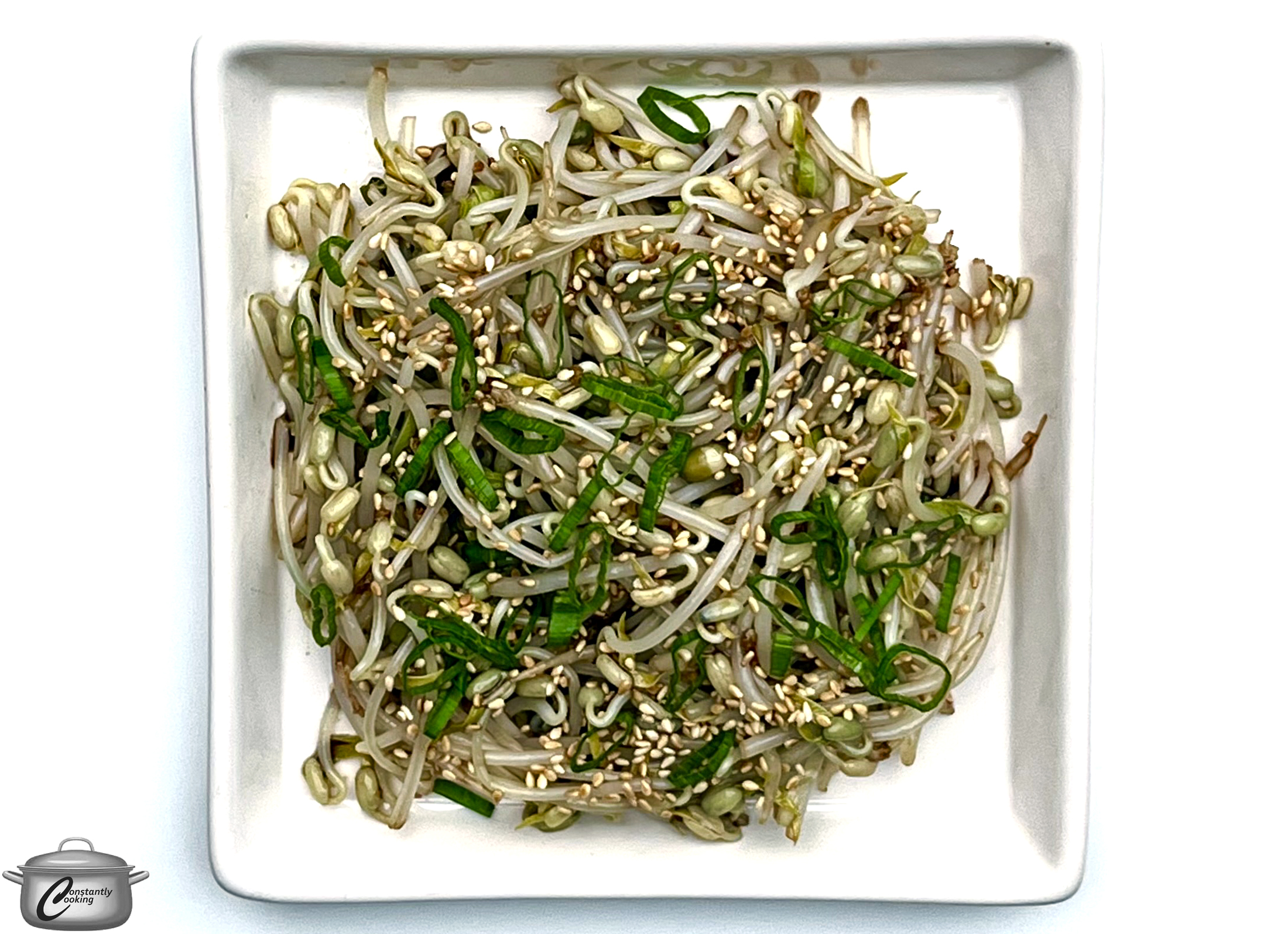 - Within an hour of blanching the bean sprouts, transfer them to a serving bowl. Drizzle with dressing and toss to combine. When ready to serve (within the hour), toss again and sprinkle minced green onion and sesame seeds over top.