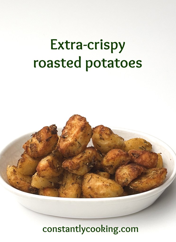 I love it when cooking involves a bit of a science experiment. In this case, research suggested adding baking soda to the pot when parboiling potatoes; having water of higher alkalinity than usual helps the outside edges of the potatoes break down more, opening up the possibility of a crisper outside texture. It works!! Using an air fryer to roast the parboiled potatoes is so simple and effective. They could, however, also be roasted on a metal baking tray in a 450F oven for about 50 minutes (leave them undisturbed for the first 25 minutes then use a thin metal spatula to pry them off the sheet and flip them before returning the tray to the oven). Have fun experimenting with seasoning for this recipe – you can use any dry herb mixture you like, such as a combination of basil, oregano and thyme, or Herbes de Provence. For a fun and unexpected flavour twist, you could also use taco seasoning or Montreal steak spice. I don’t recommend using chopped fresh herbs as they will burn during the roasting process. Alternatively, you can use a flavoured olive oil with great results.