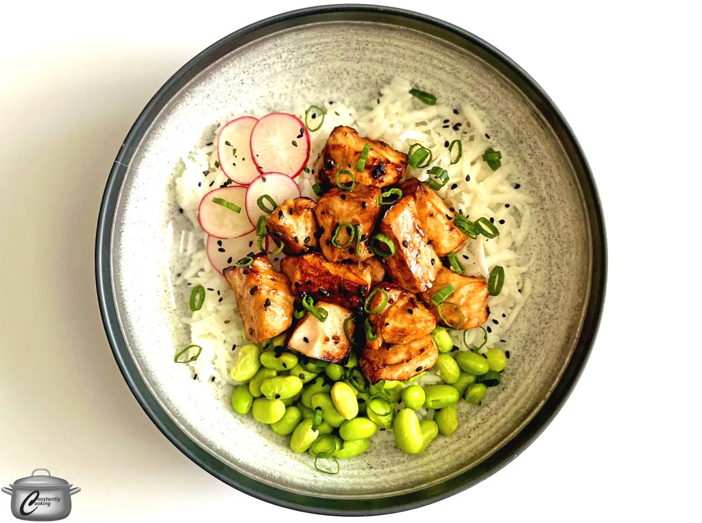 - To assemble bowls, divide the rice between 2 broad bowls. Top with cooked salmon cubes, edamame, grated turnip and radish slices. Scatter green onions and sesame seeds over top and serve hot, passing the warm, thickened sauce in a jug at the table.