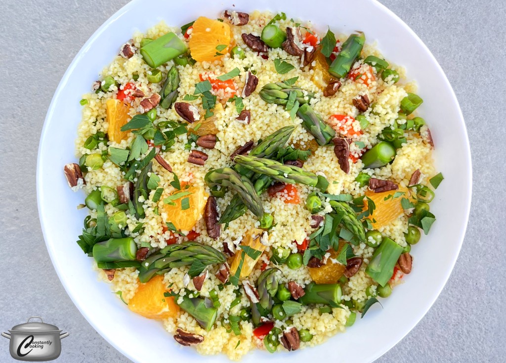 - Transfer cooked couscous to a serving bowl and add asparagus, peppers, peas, oranges and minced green onions; stir gently to combine. Salad can be prepared ahead to this point and stored at room temperature for up to 2 hours.