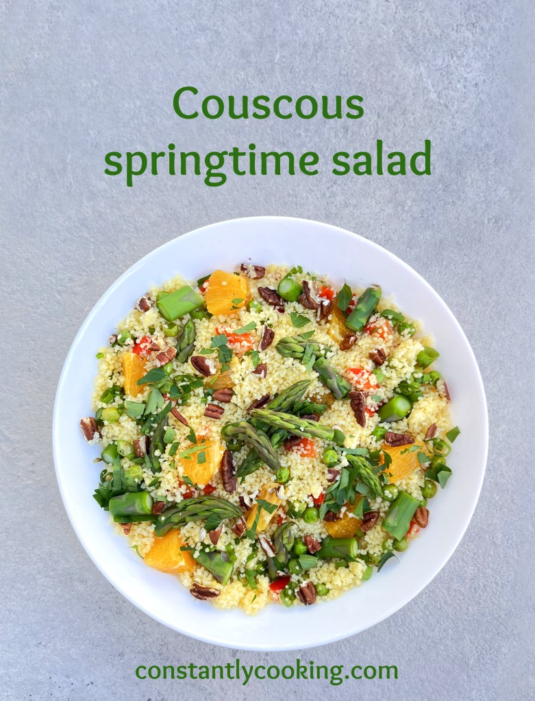 I love grain salads, especially when served as a main course for brunch, lunch or dinner. This one is hearty and delicious, with bright, fresh springtime flavours and colours, though it can be enjoyed at any time of year. I recommend waiting until just before serving to dress this salad as the couscous absorbs the liquid pretty quickly so the salad can be a bit dry if dressed in advance. If you don’t prefer couscous, feel free to swap in cracked wheat (bulgar or freekeh) or quinoa and adjust the amount of cooking liquid according to package directions. Whatever grain you choose, you’ll find this dish as nutritious as it is pretty.