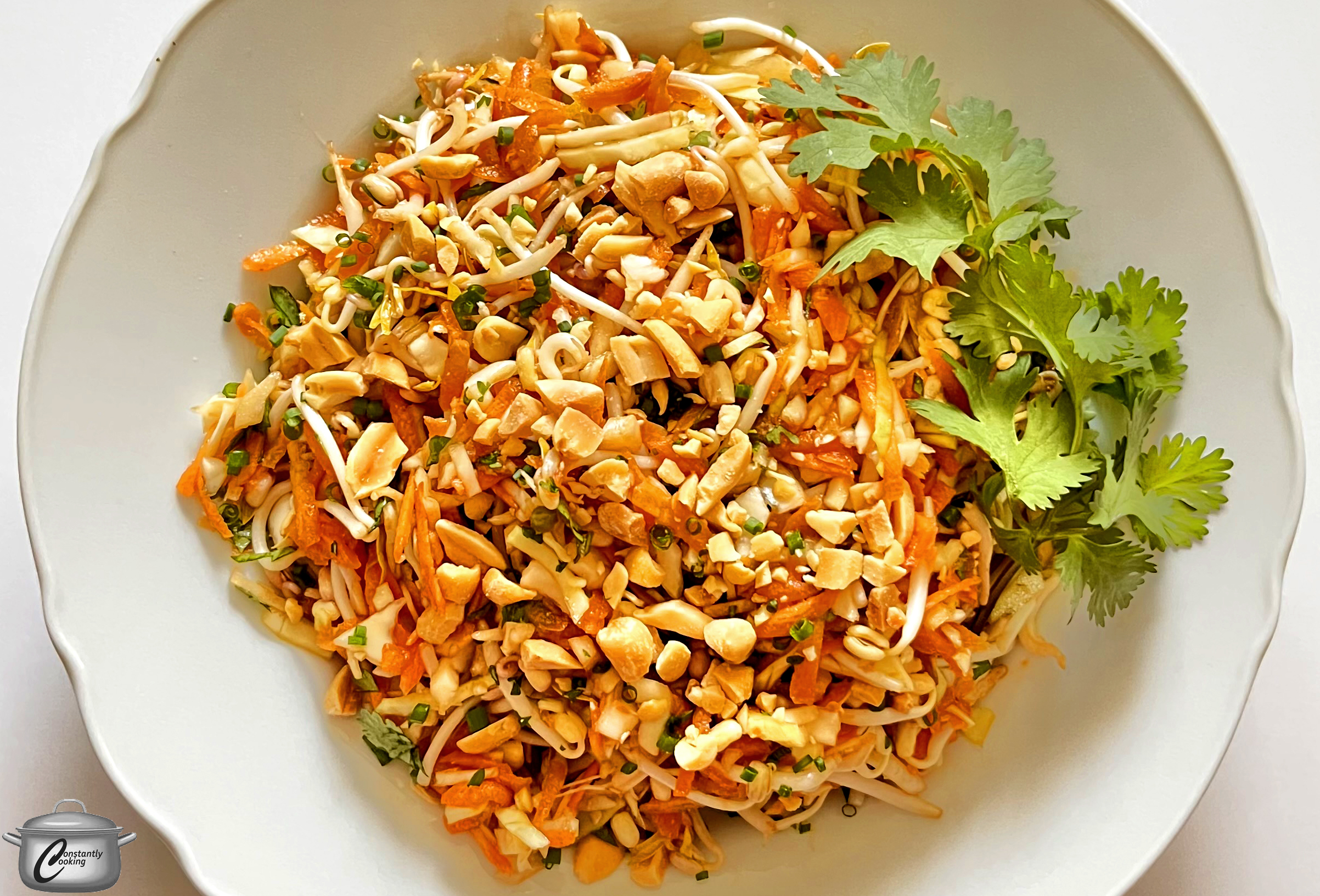 - Combine bean sprouts, cabbage, carrots, and half of the cilantro in a large bowl.
