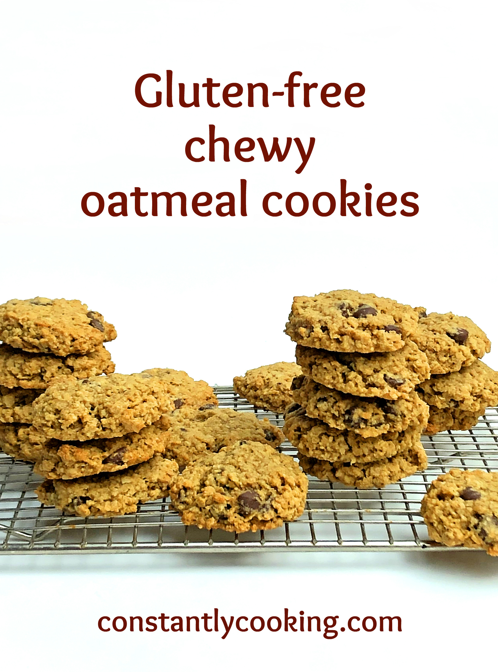 I love that whenever I serve these cookies, people are surprised to learn they are gluten-free. I suspect it is because a number of years ago, it was a bit challenging to find gluten-free recipes that produced cookies with a chewy texture (but one of my secrets for many cookie recipes – including those with wheat flour – is to bake them for less time than our moms and grandmas typically did). Note that not all oats are prepared in dedicated gluten-free facilities so if allergies are an issue, be sure to check the package’s label. And, if you must, you can swap in raisins for the chocolate chips if you prefer. If you’re looking for more easy gluten-free baking ideas that everyone will love, check out my rhubarb crumble pie squares which can easily be adapted for a variety of fruits.