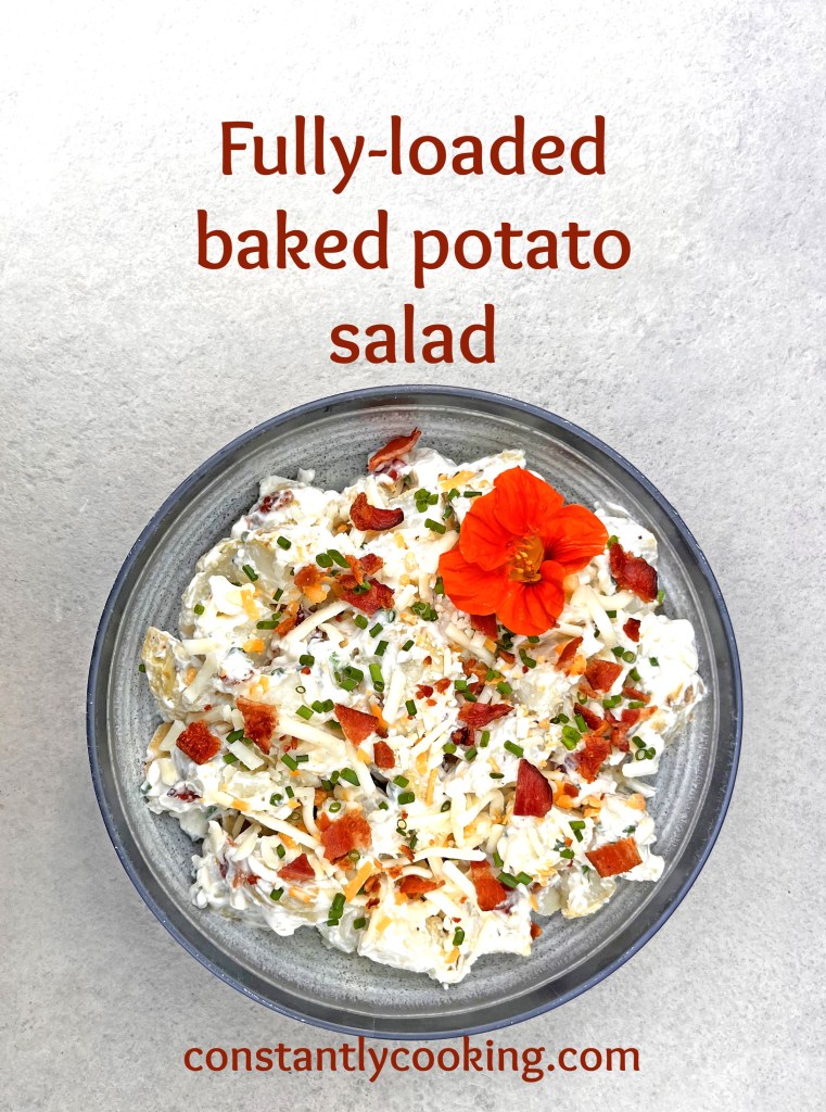 I thought that once I’d finalized my recipe for classic-style potato salad a decade or so ago, I’d not be looking for another one ever again. Famous last words! I was reflecting on my fondness for baked potatoes and the next thing I knew, I was creating a fabulous new version of potato salad, using baked Russets. Be sure not to skip the step of oiling the potato skins before baking; it makes it much easier to peel the papery outer layer off afterwards. This dish tastes best if made 6-24 hours before serving (though you can shorten that wait time if you must). If you like this flavour combination, you might also enjoy my fully-loaded baked potato chowder.