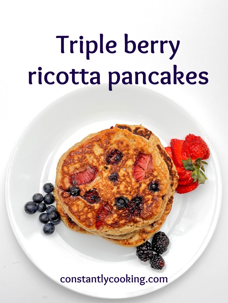 I love adding ricotta to muffins, loaves, pancakes and more as I find it adds so much flavour and texture, plus the extra protein is a welcome bonus. These pancakes have more staying power than conventional ones, and my technique of scattering the berries on the batter right in the pan ensures even distribution. You can use a classic ‘bumbleberry’ combination of blueberries, raspberries and blackberries, or come up with your own blend of fruits. If you like this recipe, you might also enjoy these fluffy yet substantial lemon-oat-ricotta pancakes.