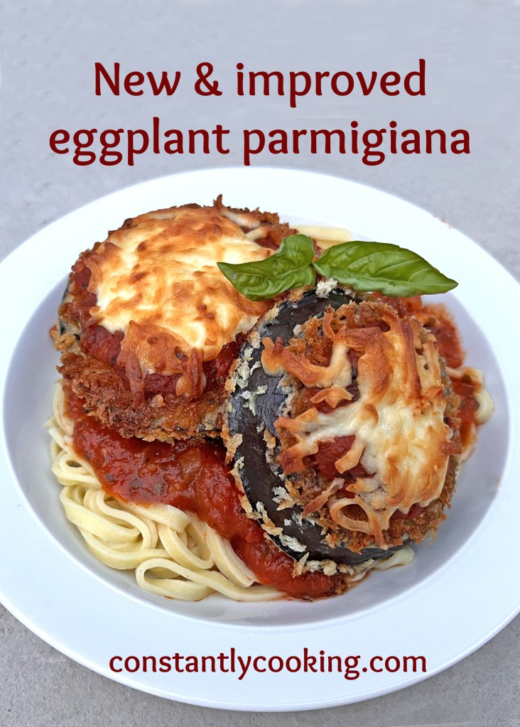 I thought I didn’t like eggplant parmesan. All the times I’d previously tried it, it had a mushy texture and because it’d been prepared the traditional way, as a layered casserole, it didn’t serve up in a particularly attractive fashion. I got to thinking about my fabulous Portobello parmigiana and realized a similar method could produce a wonderful, meaty-textured, pretty eggplant parm – and I was right. You can use purchased marinara sauce, if you prefer, though the recipe below is easy and really tasty. We like to toss hot, cooked pasta with the remaining marinara and divide among serving bowls, then place the cheesy, saucy eggplant rounds on top of the pasta. If you happen to have any leftover cooked eggplant, reheat gently in the oven then layer in a bun with a little more sauce for a delectable sandwich. My preferred wine pairing with this dish is Brotte’s Père Anselme La Fiole, a delightful red Côtes-du-Rhône that I find to be a great match with a wide variety of comfort foods. The uniquely-shaped bottle houses a medium-bodied wine with pleasing fruit and spice notes, blended from Grenache and Syrah grapes.