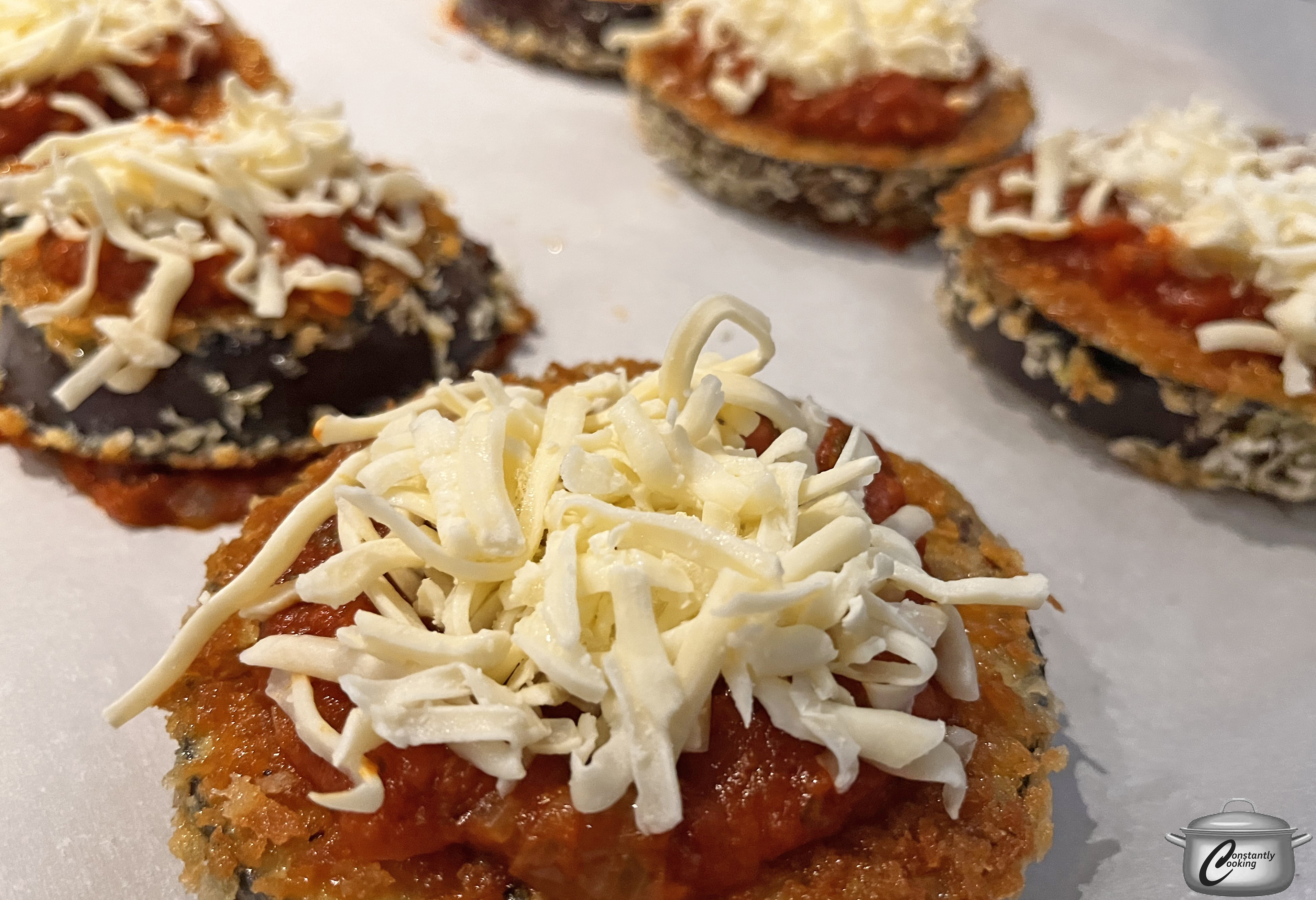 - Once all eggplant rounds have been dipped and coated, cook them in batches. Heat 1-2 tablespoons (15-30 mL) of oil at a time in a large skillet, then fry eggplant 2-3 minutes per side until golden brown. Place each cooked eggplant round on one of the dollops of sauce on the prepared baking tray. Repeat until all eggplant has been fried. Note that you can also spray the coated eggplant lightly with oil and air fry or oven bake if you prefer; simply cook using method of choice until golden brown.