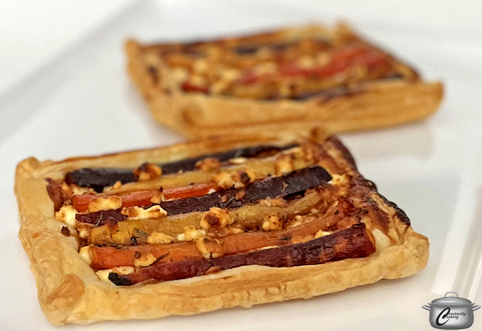 - Sprinkle approximately 1 tablespoon of the crumbled goat cheese (reserving a little for topping) on each pastry rectangle then lay the roasted carrots in an attractive pattern over the goat cheese and spoon any liquid from cooking the carrots over top. Sprinkle with a bit more goat cheese.