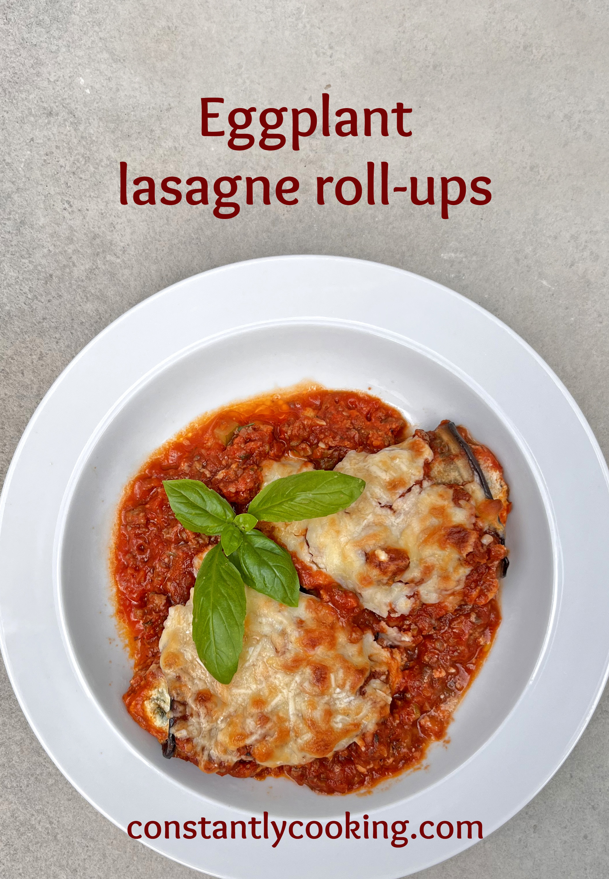 While I am steadfastly in love with my eggplant parmigiana recipe, this new eggplant delight is definitely just as tasty, not to mention quicker to prepare as there is no breading or frying involved. It was loosely inspired by another family favourite – these spinach and portobello lasagne roll-ups. I sometimes make this with the marina sauce from the above-linked eggplant parm recipe; you can also use a meat sauce if you don’t wish to make a vegetarian version of this dish. This same method works well with large zucchini also. You can freeze unbaked eggplant lasagne roll-ups; just cover dish tightly (I use plastic wrap followed by foil) and freeze for up to 2 months. Thaw before baking.