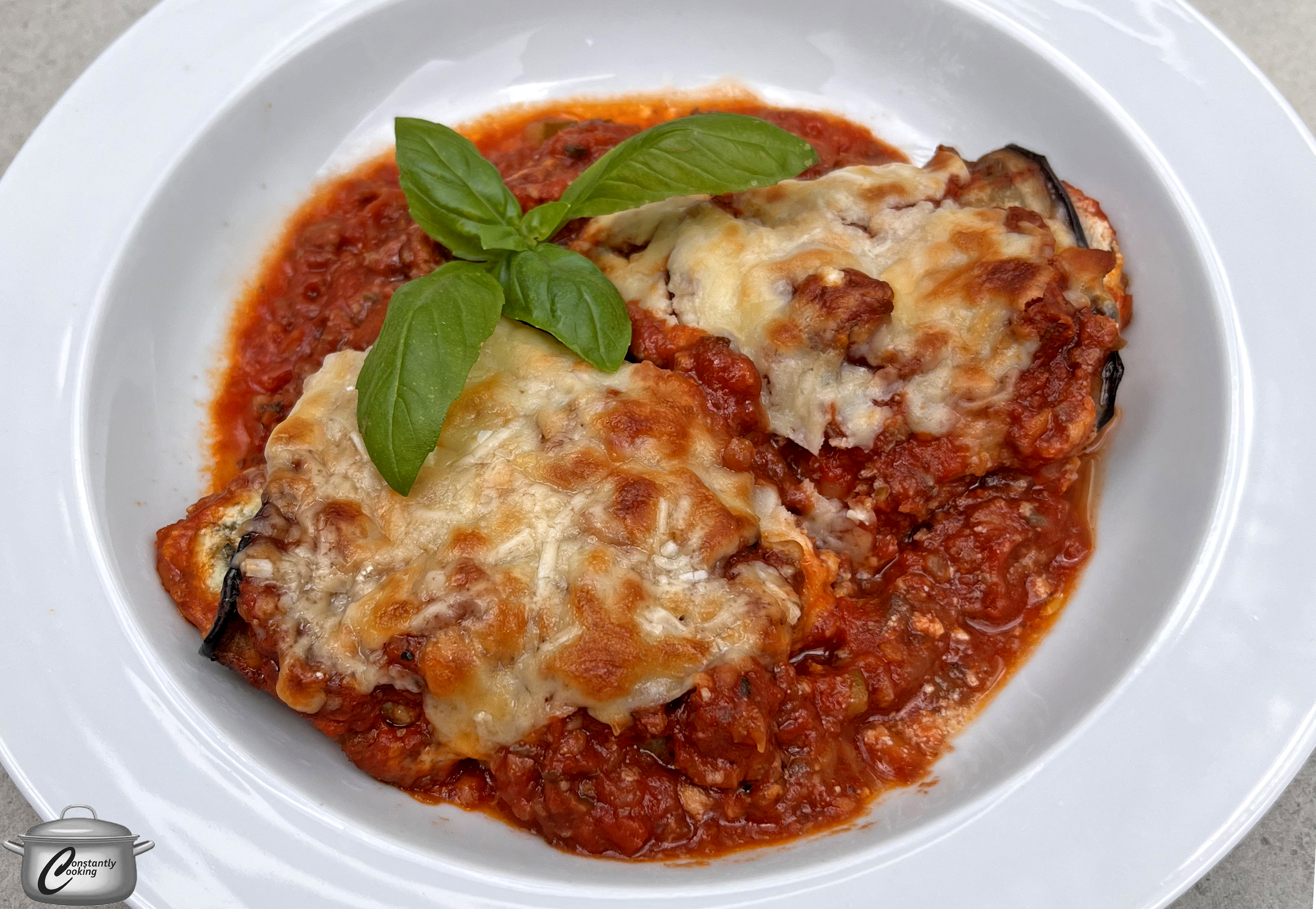 • When eggplant slices have cooled, assemble the dish. Spread a thin layer of marinara on the bottom of an 8×10 inch (20×25 cm) baking dish. Spoon 2 tablespoons of ricotta filling into the centre of each eggplant slice, then roll them up and lay them, seam side down, in the baking dish.