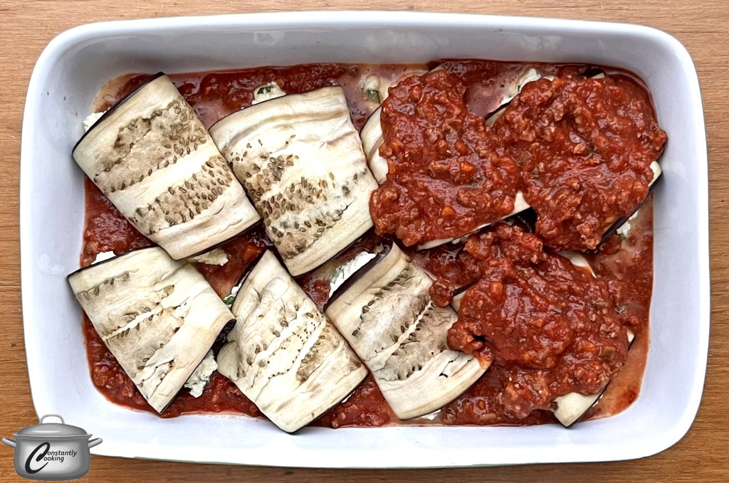 • Spoon the remainder of the marinara sauce over the eggplant rolls.