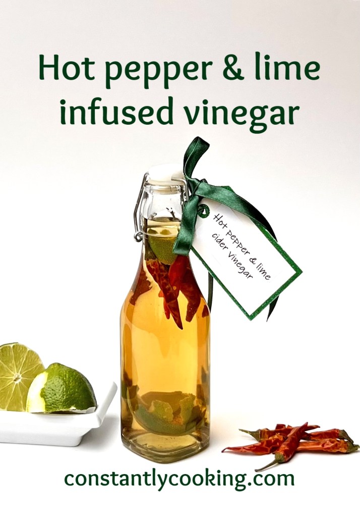 One of the great things about making infusions like this is that you don’t have to measure precisely. I base the quantity of vinegar on what my final ‘pretty’ bottle or jar can hold; if yours is larger or smaller, just adjust accordingly. Note that if you want to make hotter vinegar to please someone who likes things spicy, crack the dried chilies open slightly before adding to the vinegar so they release more spice into the liquid. If gifting, you can also include a card with suggestions on how to use the vinegar, such as in salad dressings, soups, pan sauces, marinades and more.