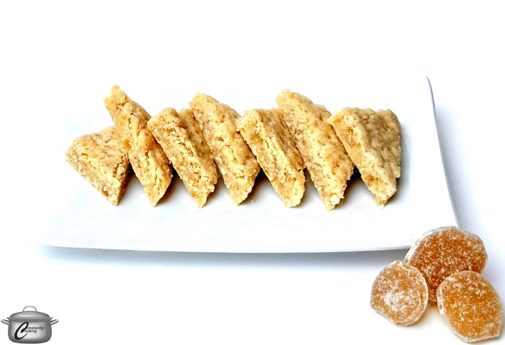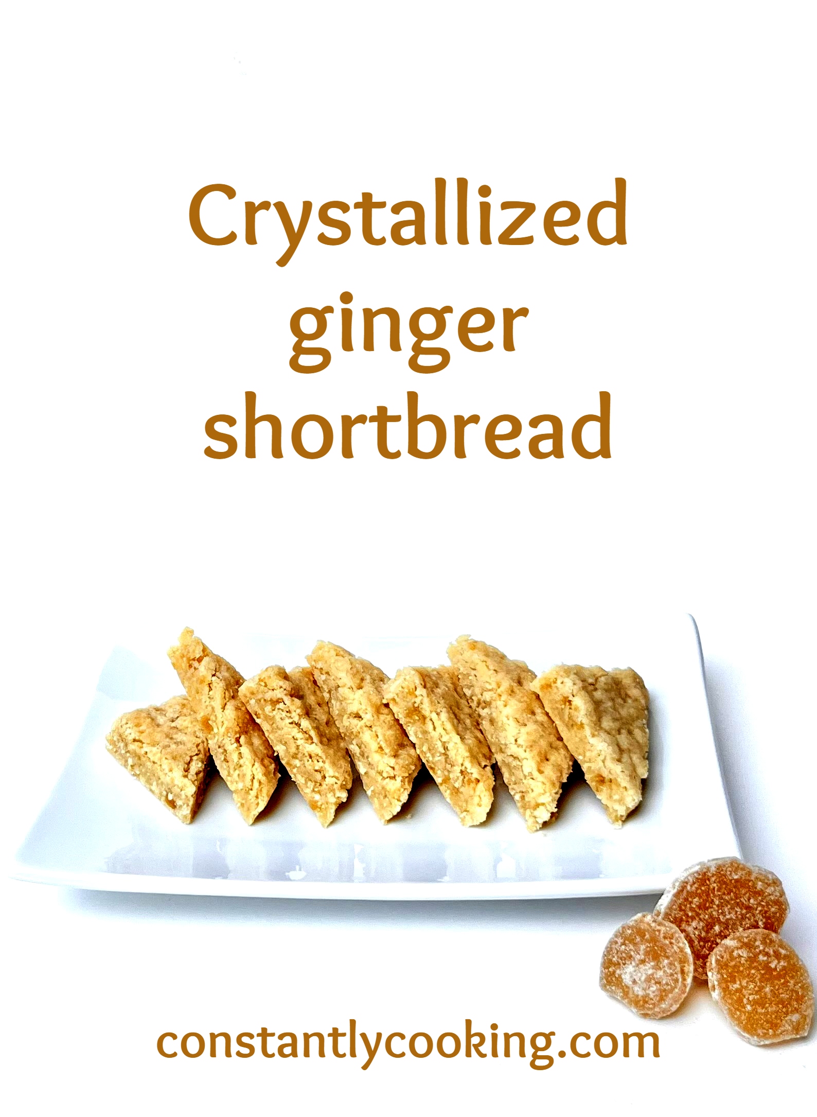 I adore the flavour of ginger and use it often in both cooking and baking. Crystallized ginger – discs of the root which have been cooked in sugar syrup then dried and coated in sugar – has a really subtle flavour that makes it a perfect add-in for shortbread without overwhelming these squares. Note that it is not quite the same as candied ginger which traditionally comes in syrup rather than being dried. Cutting the panful of shortbread into triangles makes them look more festive, in my opinion, and you can make the shapes as large or small as you wish. These tasty treats would make a delightful holiday or hostess gift, and they freeze well as a bonus.