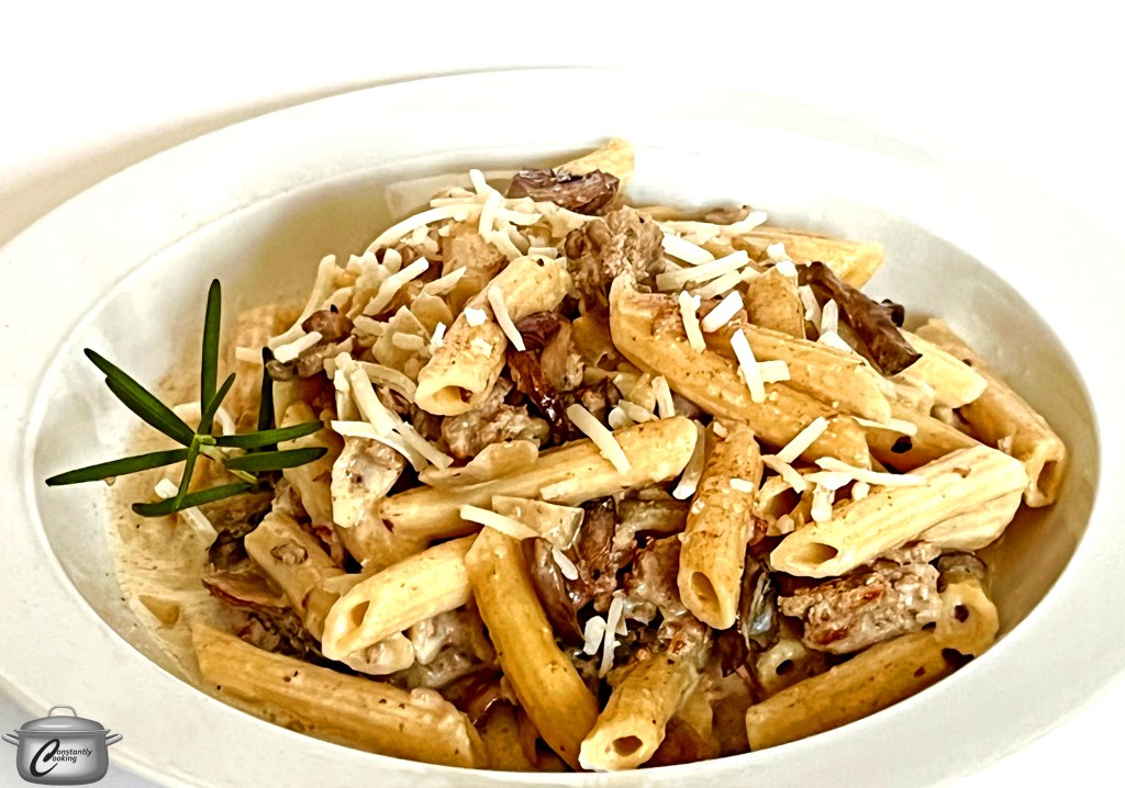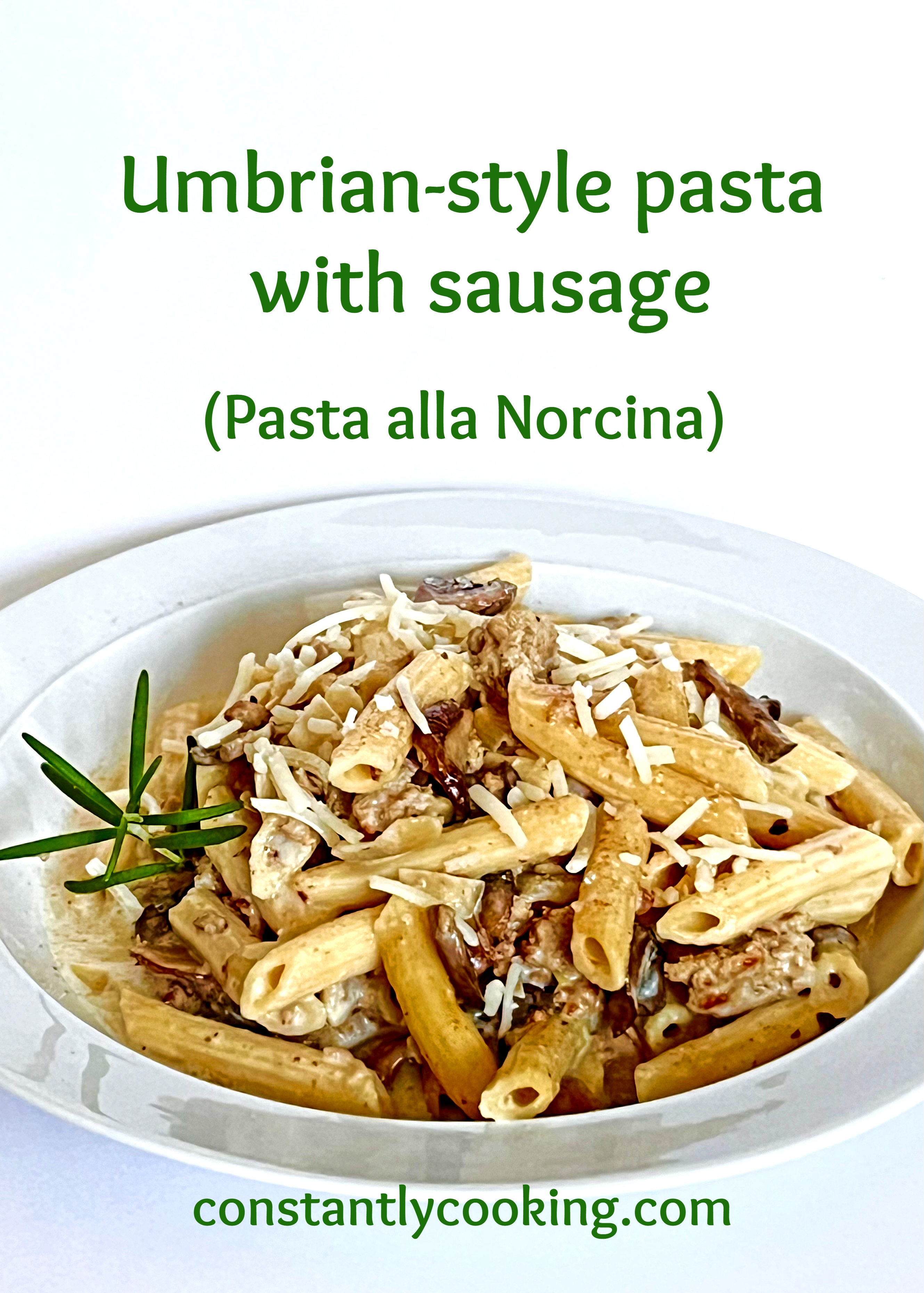 The traditional Norcia-style sausage – a specialty of Italy’s Umbria region – used for this pasta differs in flavour from most Italian-style sausages sold in North America (it doesn’t include fennel seed or hot pepper flakes, for example). As a workaround for this classic and incredibly delicious dish, I’ve come up with a sausage-like mixture made with fresh ground pork that I feel replicates Norcia’s sausages well, but if you prefer you could absolutely use Italian-style garlic sausages or sweet Italian sausages instead. You’ll need 12 oz/340 grams or about 4 regular-sized sausages, with the meat removed from the casing. I like to include cremini mushrooms and finish the dish with a pinch of truffle salt on each serving; these touches mimic the flavours imparted by the traditional use of shaved black truffles on top, appropriate given that Umbria is the world capital of truffle production. If you are planning on leftovers, scoop out and reserve additional pasta cooking water to use when reheating pasta. And just in case you’re wondering whether or not the good folk of Norcia really know their sausages, be aware that the town itself gave rise to the Italian term for pork butcher – famous across Europe – which is norcino.