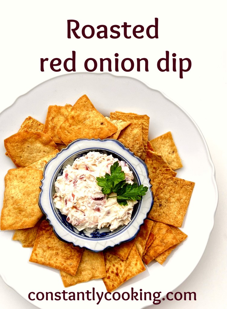 Having grown up on the not-so-fancy dip of dehydrated onion soup mix stirred sour cream, I’ve not always been a fan of onion dip. Until now. I love this dip because it’s so easy to prepare and can be enjoyed chilled, at room temperature or even bubbling hot. Red onions give it a nice colour and their flavour when roasted is fantastic – much mellower and sweeter than yellow onions. We use it as a sandwich spread and a dip for vegetable sticks and chips; I also like to serve it warm with crackers. This dip can be made fully in advance and refrigerated, or you can roast and refrigerate the onions ahead of time and assemble whenever it’s convenient.