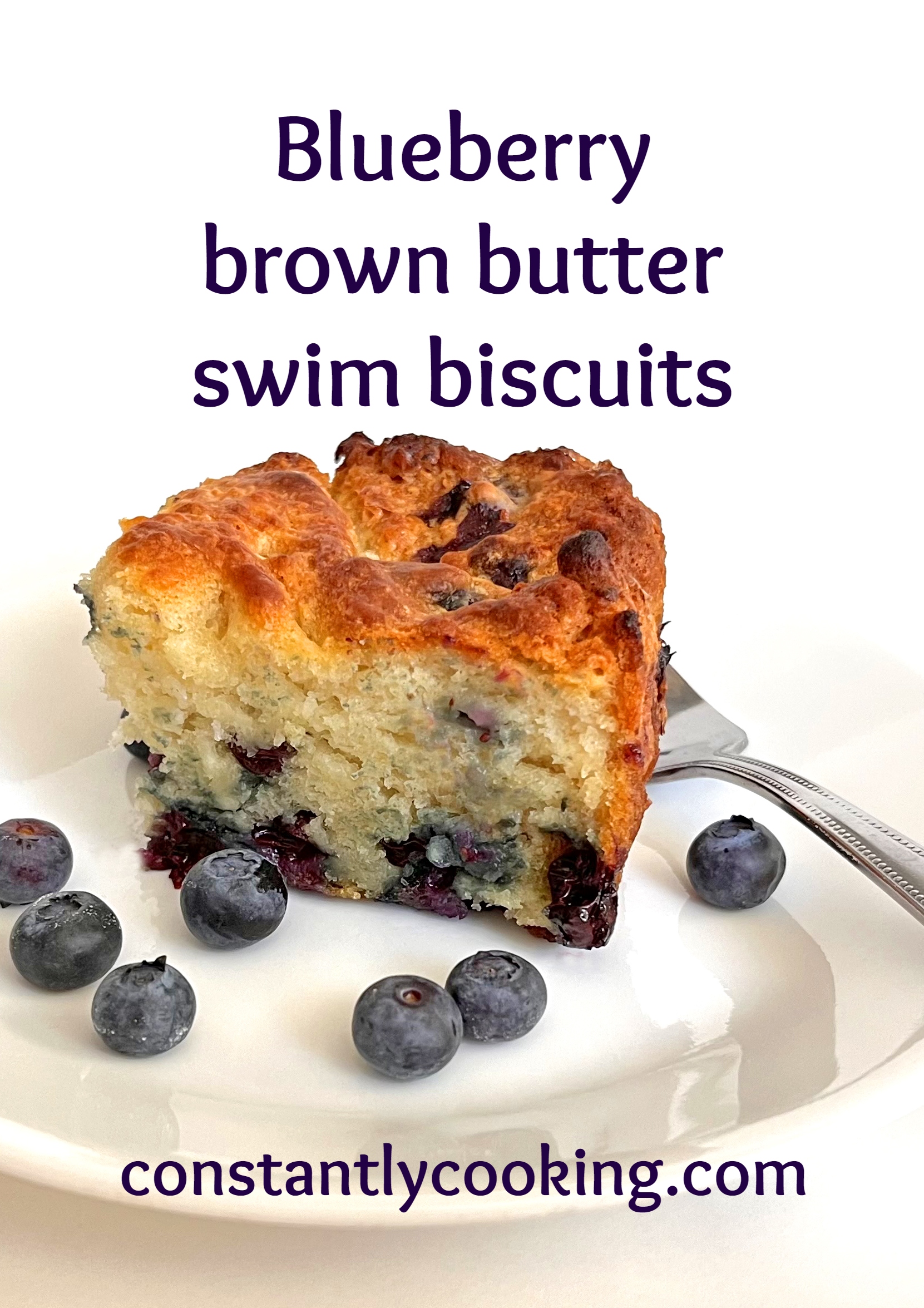 A novel I read last year which was set in the Southern U.S. drew my attention to a new-to-me food called ‘butter swim biscuits’. Why the name? Well, it’s because these biscuits are literally swimming in butter as they bake. I thought my ‘regular’ buttermilk biscuits were pretty great, but I finally decided I had to try making swim biscuits and I have to say they are absolutely stellar and so incredibly simple to prepare. The quick extra step I added – browning the butter in the oven while it preheats – is super easy and adds a delightful nutty tone to the flavour of the biscuits, which come out of the oven super moist in the middle with a flaky, crisp top crust. You can omit the blueberries or swap in grated cheddar and/or diced cooked bacon for a savoury version of this treat. Don’t be deceived by the cake-like appearance in the photo – these truly are biscuits at their finest and perfect for breakfast or snacks anytime of the day.