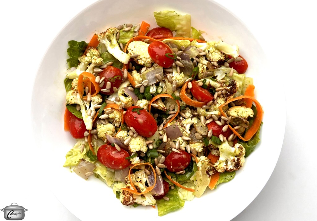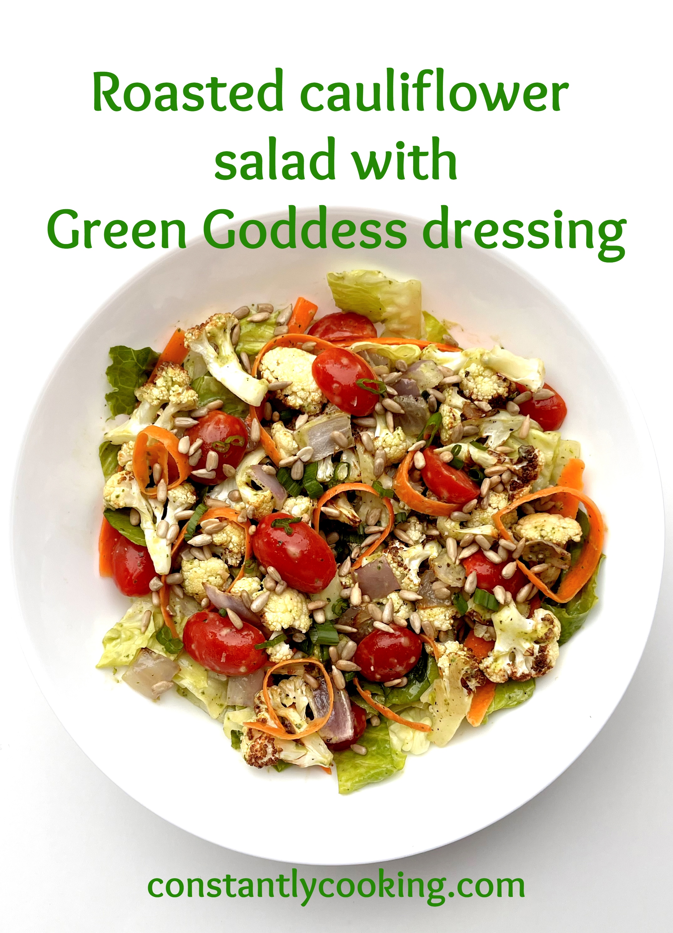 • When cauliflower and onions are cooked, transfer to a large serving bowl and drizzle with about one third of the prepared Green Goddess dressing. Toss to coat evenly. Add carrot ribbons, halved cherry tomatoes and chopped lettuce and add another few tablespoons of dressing; toss to coat again, adding more dressing if needed.