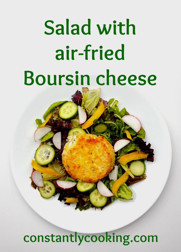 I  have often said that if I had to pick a dish to eat every day for the rest of my life, it would be salad. I’m planning to amend my choice to be this specific salad, because the addition of crispy-on-the-outside, creamy-on-the-inside warm cheese is absolutely fantastic. Boursin, a Quebec-made cheese widely available across Canada, comes in several different flavours so you can choose the one you prefer (my favourite is garlic and fine herbs). If you can’t find Boursin, you could substitute several smaller rounds of goat cheese (cut about 1/2 inch or 1.25 cm thick). I’ve also enjoyed this air-fried Boursin drizzled with hot honey and served with crackers, in case you’re looking for another way to enjoy this tasty treat.