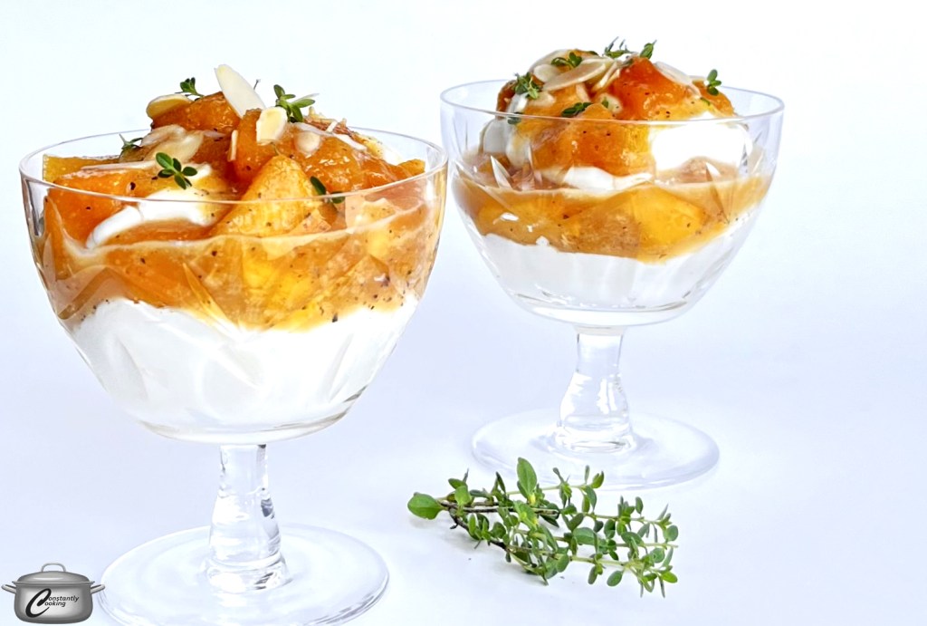 As someone who loves to cook with the seasons, I find myself feeling like a kid at Christmastime waiting throughout the summer for various local fruits and vegetables to become available. Ontario peaches have just started arriving in my local shops and I cannot get enough of them. This dessert is a great way to enjoy seasonal fruit; you’ll discover that the combination of mascarpone and whipping cream is a great contrast to the sweet topping. The parfaits can be assembled in your choice of dishes – small canning jars are great – up to an hour before serving. If you like this no-bake delight, be sure to check out my cherry cheesecake parfaits and my apple pie parfaits.