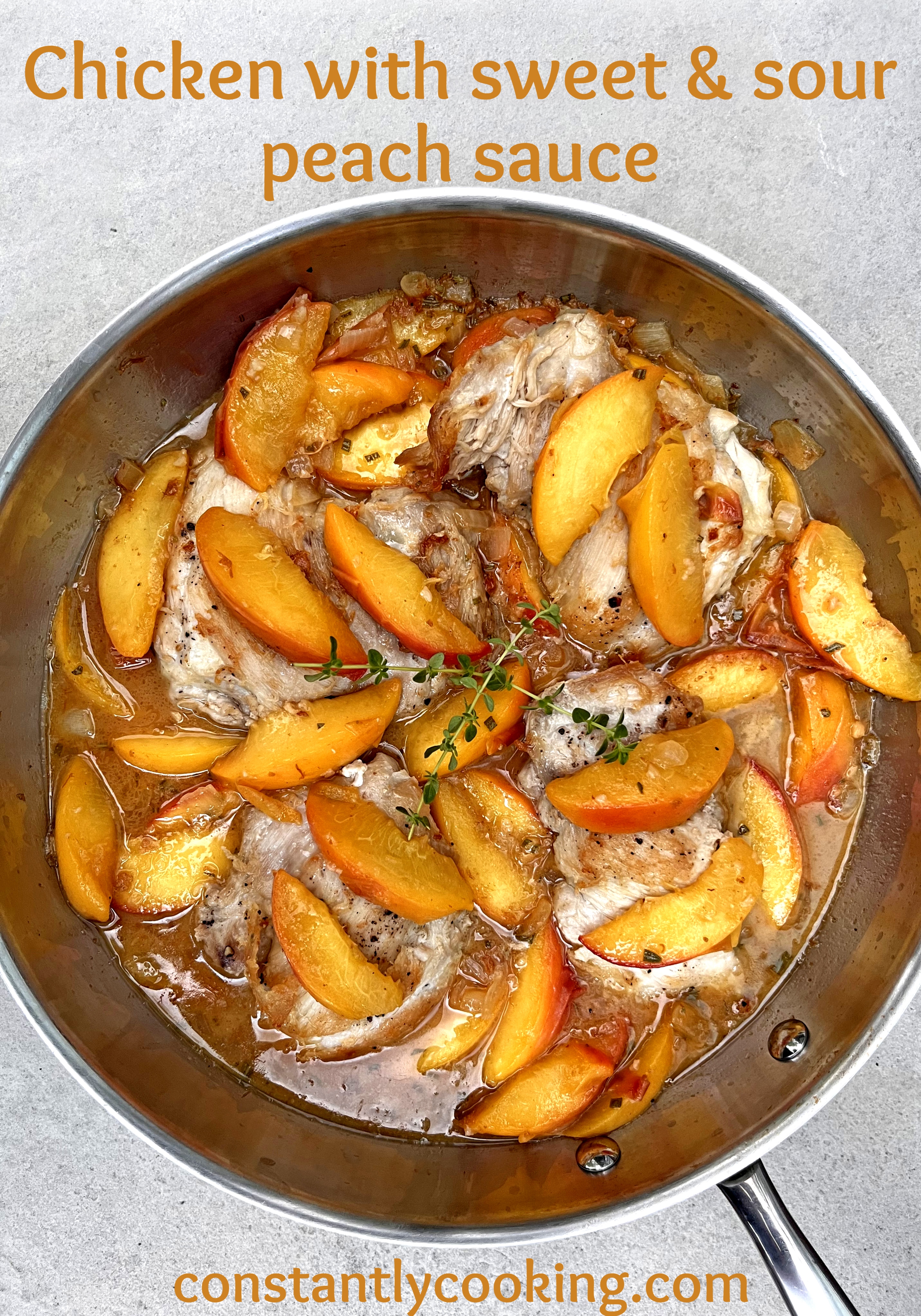 This one-skillet chicken dish is full of summery flavours and takes very little time to prep or cook. There’s no need to peel peaches unless you’re fussy about eating the skin. If doubling the recipe, you’ll need to cook the chicken in batches and you may need to add a little extra oil between batches. The peach sauce is also delicious served over grilled chicken or fish.