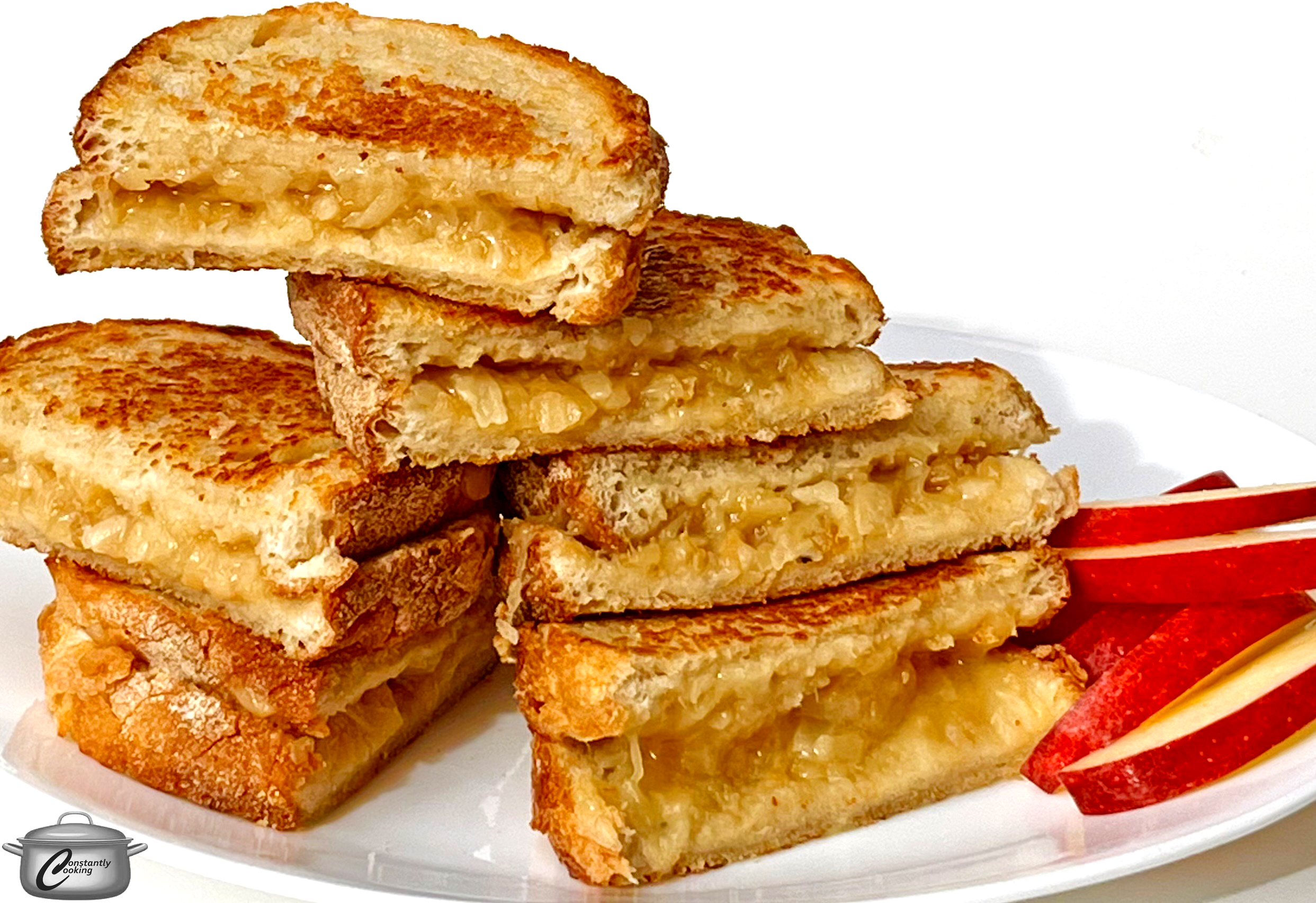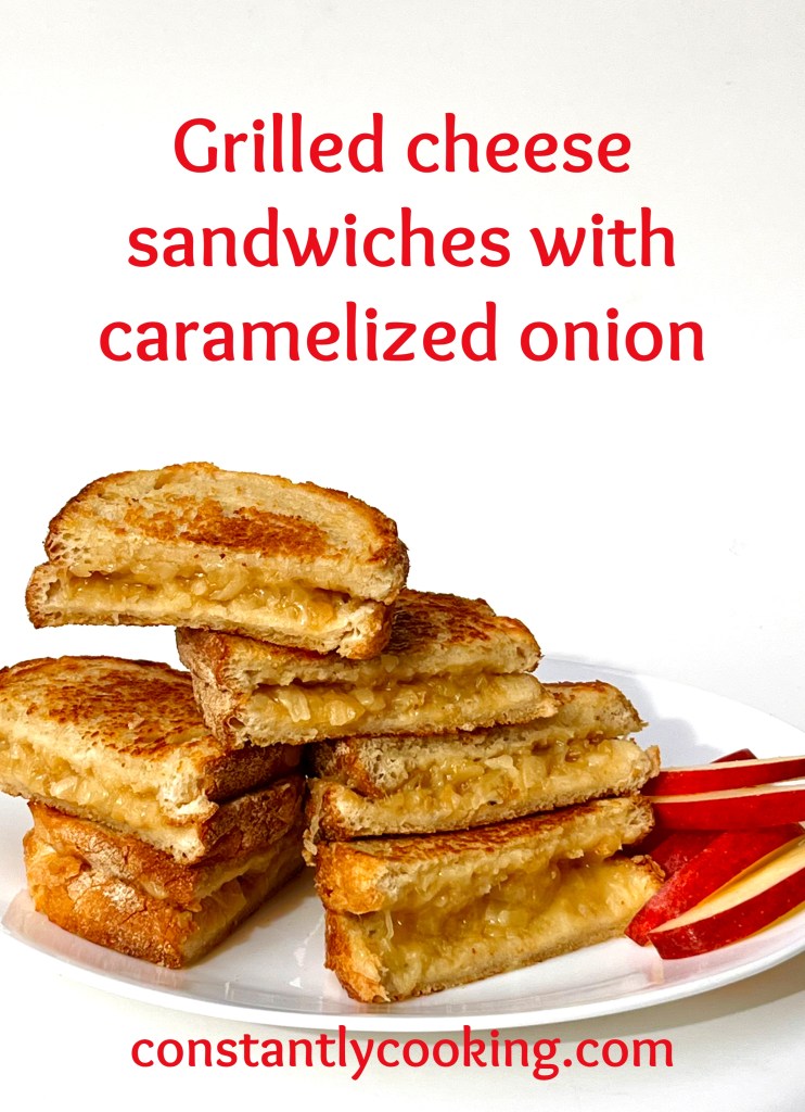 • To assemble sandwiches, combine cooled caramelized onions and grated cheese in a small bowl, stirring gently.