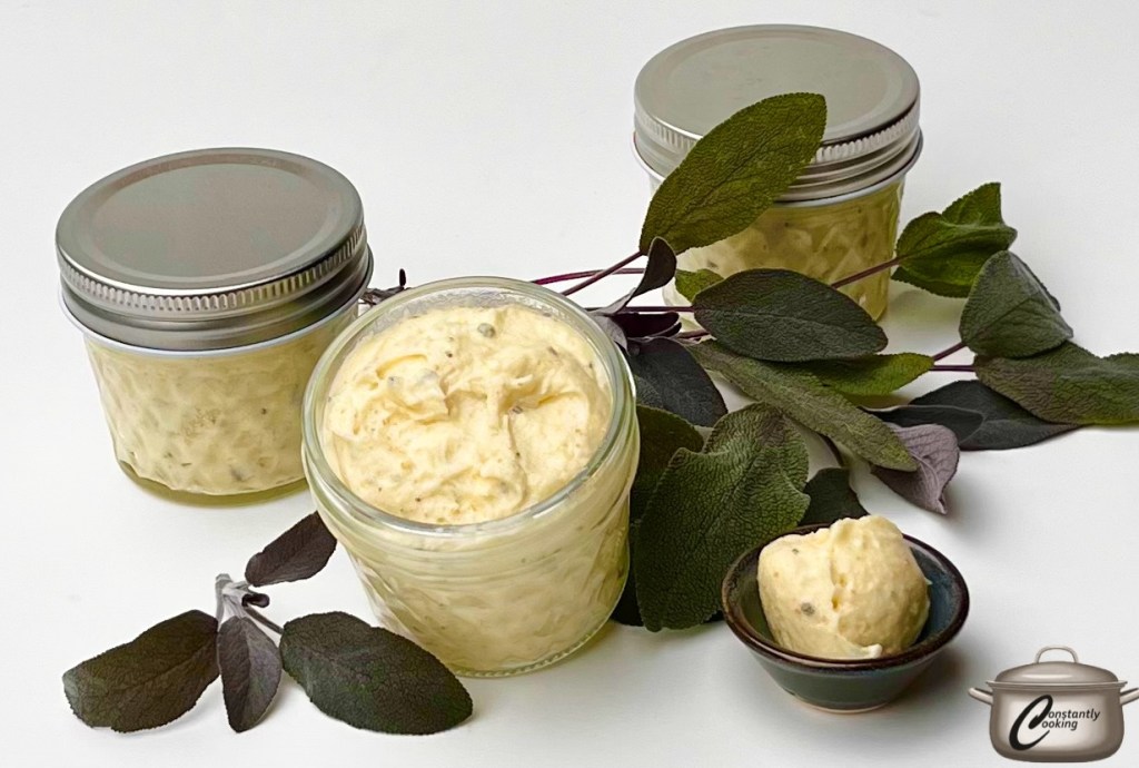I first tasted sage browned butter while staying at a charming bed and breakfast in the UK. As I perused the generous (and meticulously labeled) morning buffet, I was surprised to see the savoury butter. I wouldn’t have thought it to be an ideal element with fresh sourdough and fruit preserves but, in fact, it was absolutely spectacular (or ‘spreadtacular,’ according to my husband). Sage browned butter is a versatile concoction – in addition to the aforementioned breakfast option, I also like to serve it over hot, cooked pasta with a little lemon zest and grated parmesan; it’s also delightful on steamed vegetables or grilled fish as well. For a slightly sweeter option, consider stirring a tablespoon or two of honey into the cooling, sage-infused browned butter. Small jars of this treat make excellent host or holiday gifts. The butter is best enjoyed at room temperature.