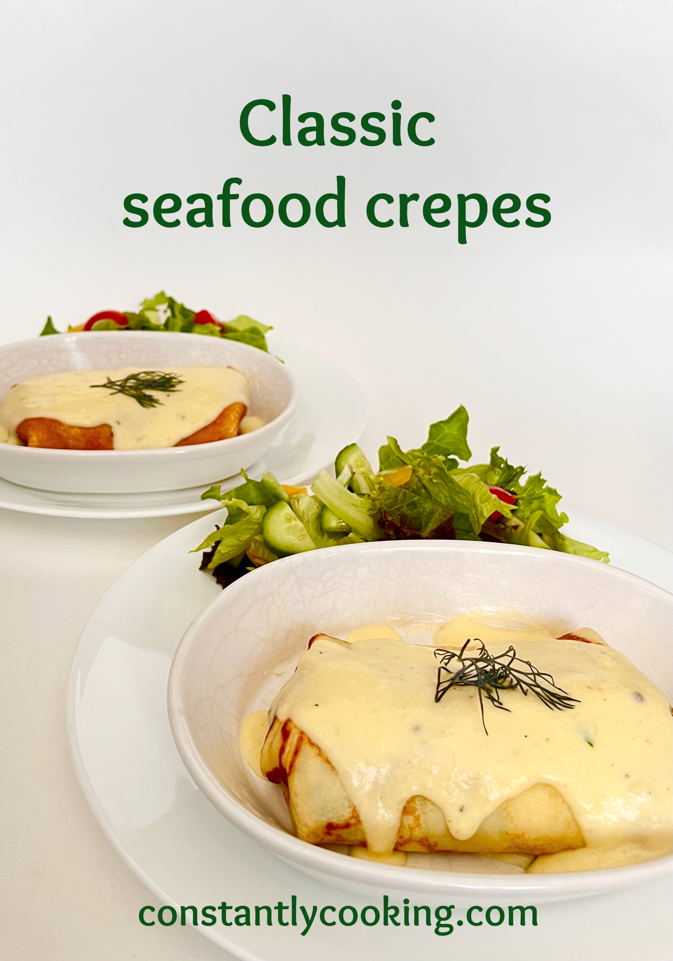 • Spoon 1/2 cup of seafood mixture into the middle of one crêpe and fold up like a burrito (fold the top and bottom edges over the filling then fold the sides in to overlap). Place seam side down in the prepared baking dish. Repeat with remaining crêpes.