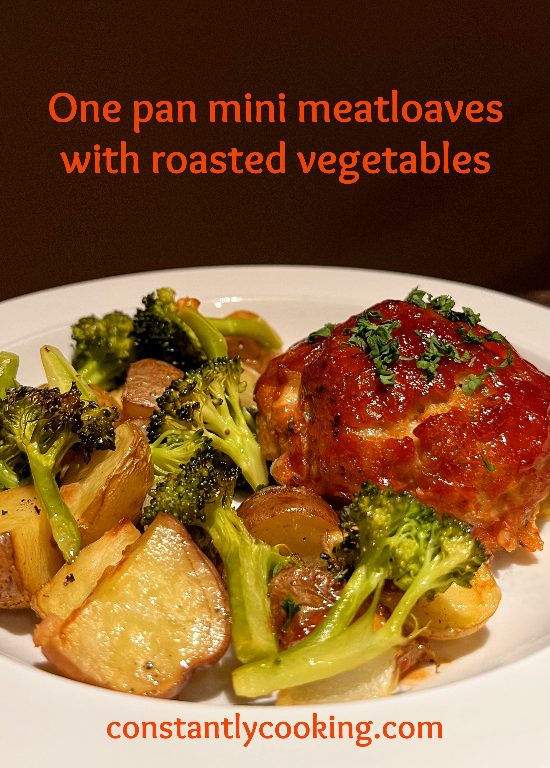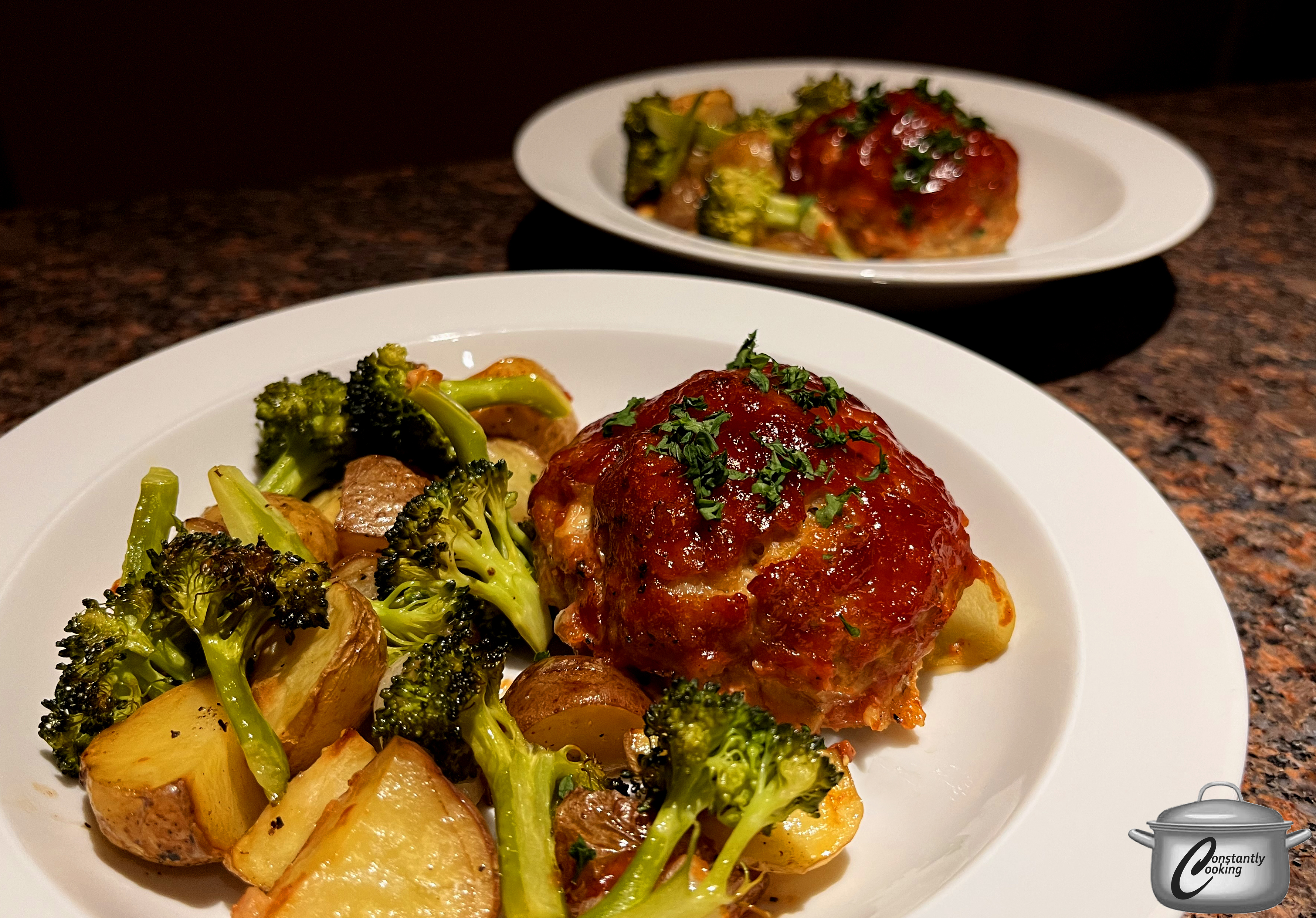 • Bake meatloaves and potatoes/onions for about 25 minutes. When potatoes are beginning to feel tender when pierced with the tip of a sharp knife, remove pan from oven and spread remaining glaze from the mixing bowl over the meatloaves. Add broccoli to pan on top of the potatoes and onions.