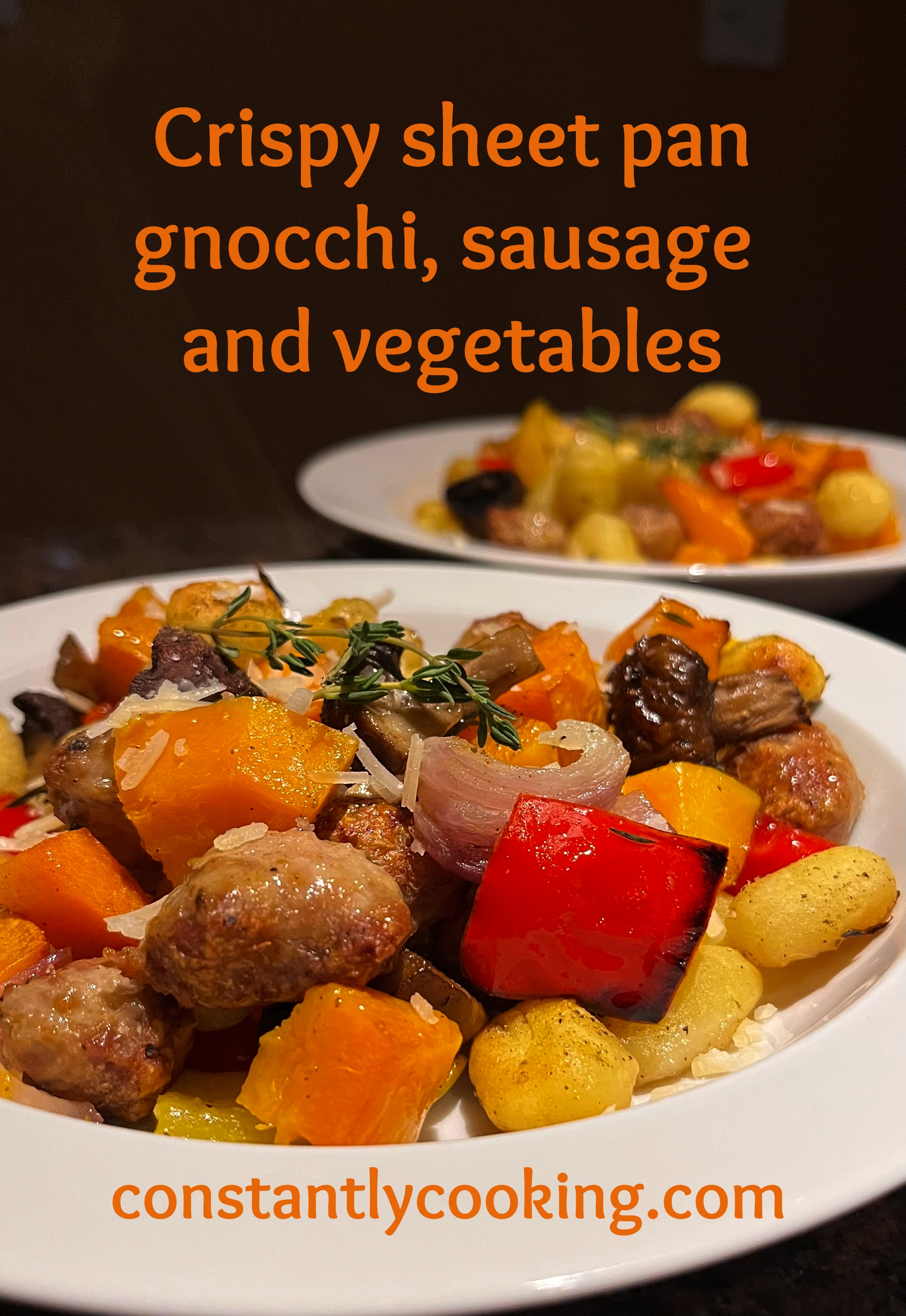 This is a fabulously delicious dish that can be prepped ahead of time and refrigerated in a large airtight container until you’re ready to cook it. Note that the recipe calls for already-cooked shelf-stable or ‘skillet’ potato gnocchi (not the kind that needs to be boiled). If you halve the recipe, it could be prepared in an air fryer with the crisping tray removed. Cooking time in an air fryer will be a bit less and you would need to toss the ingredients more frequently while cooking. In the unlikely event that you end up with leftovers of this delicious meal, I can confirm they are stellar the next day with a fried egg on top.