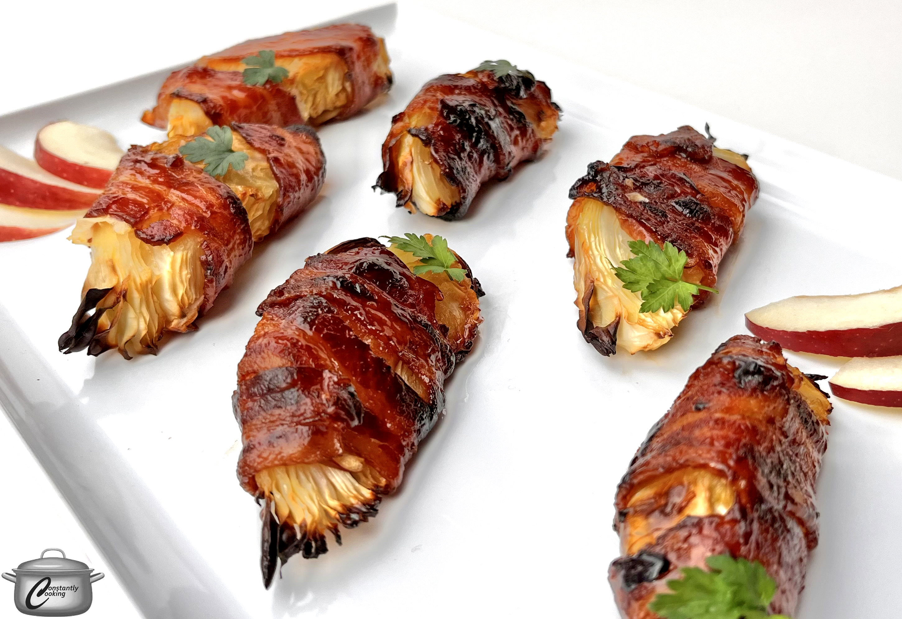 I have always loved the combination of cabbage and apples, with or without bacon. This warm cabbage salad with bacon and apples is a real crowd-pleaser; so is this purple cabbage and apple salad. I recently overheard someone talking about how their toddler would eat literally anything if it was wrapped in bacon and I thought, why not cabbage? Perhaps she’ll see this recipe and give it a whirl with her tiny taste tester (my grown-up one gave it two enthusiastic thumbs up). If you wanted to prepare this dish more quickly, you could use prosciutto instead of bacon as it will cook faster. You could also par-cook the bacon-wrapped cabbage wedges for about 20 minutes then remove from oven and let stand at room temperature for half an hour (or refrigerate for longer) before resuming the cooking process. As always, the dish will cook faster in an air fryer, if you have one – just be sure you have ample room to lay the cabbage wedges out in a single layer.