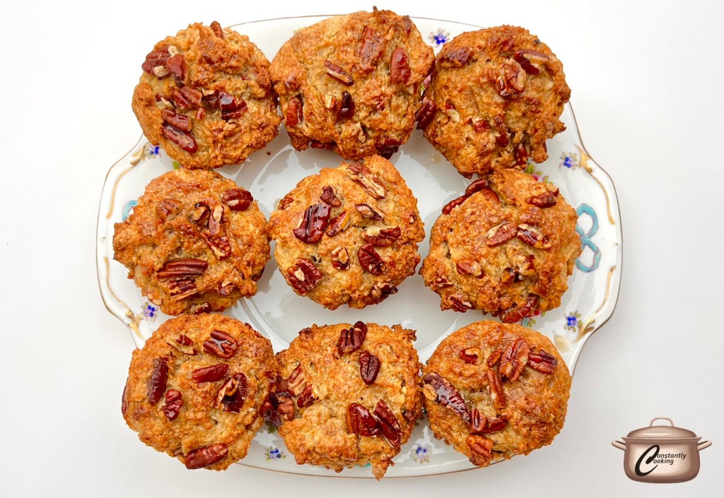 - Stir flour, baking powder, baking soda and salt together in a large mixing bowl. Add in slightly cooled butter mixture, stirring just until combined. Stir in 1 cup (115 g) of the nuts just until incorporated.