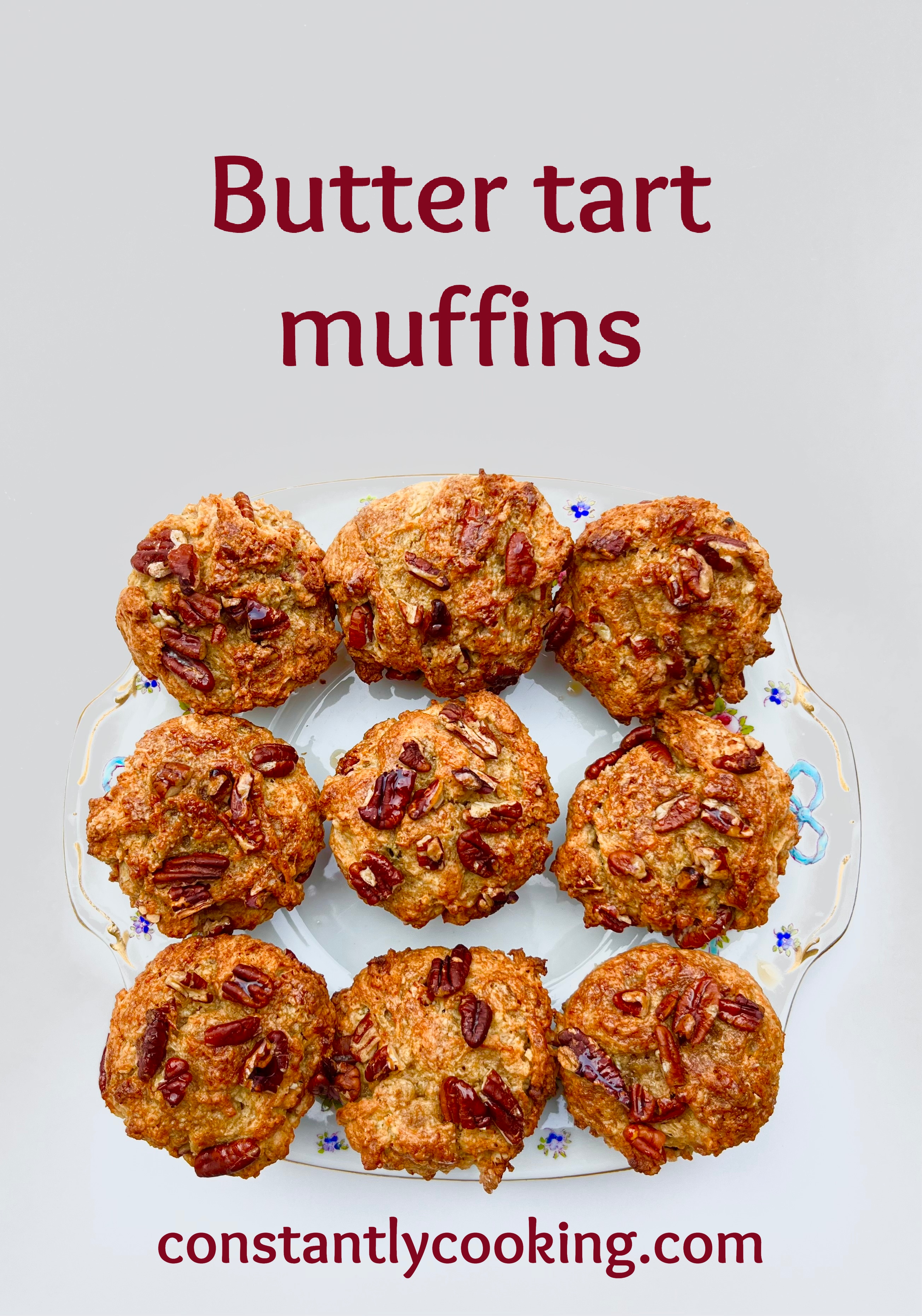 Lately I’ve been thinking a lot about quintessentially Canadian foods and of course butter tarts sprang to mind. While I love my butter tart and butter tart squares recipes, I thought it was time to try my hand at butter tart muffins which I recently saw on the menu at a local café. I am firmly NOT on ‘team raisin’ but you could add in a cup or so when cooking up the butter mixture (if you must). Unlike traditional butter tarts, I find these muffins, even with the drizzle of maple syrup at the end, to not be overly sweet, making them a super breakfast or brunch option.