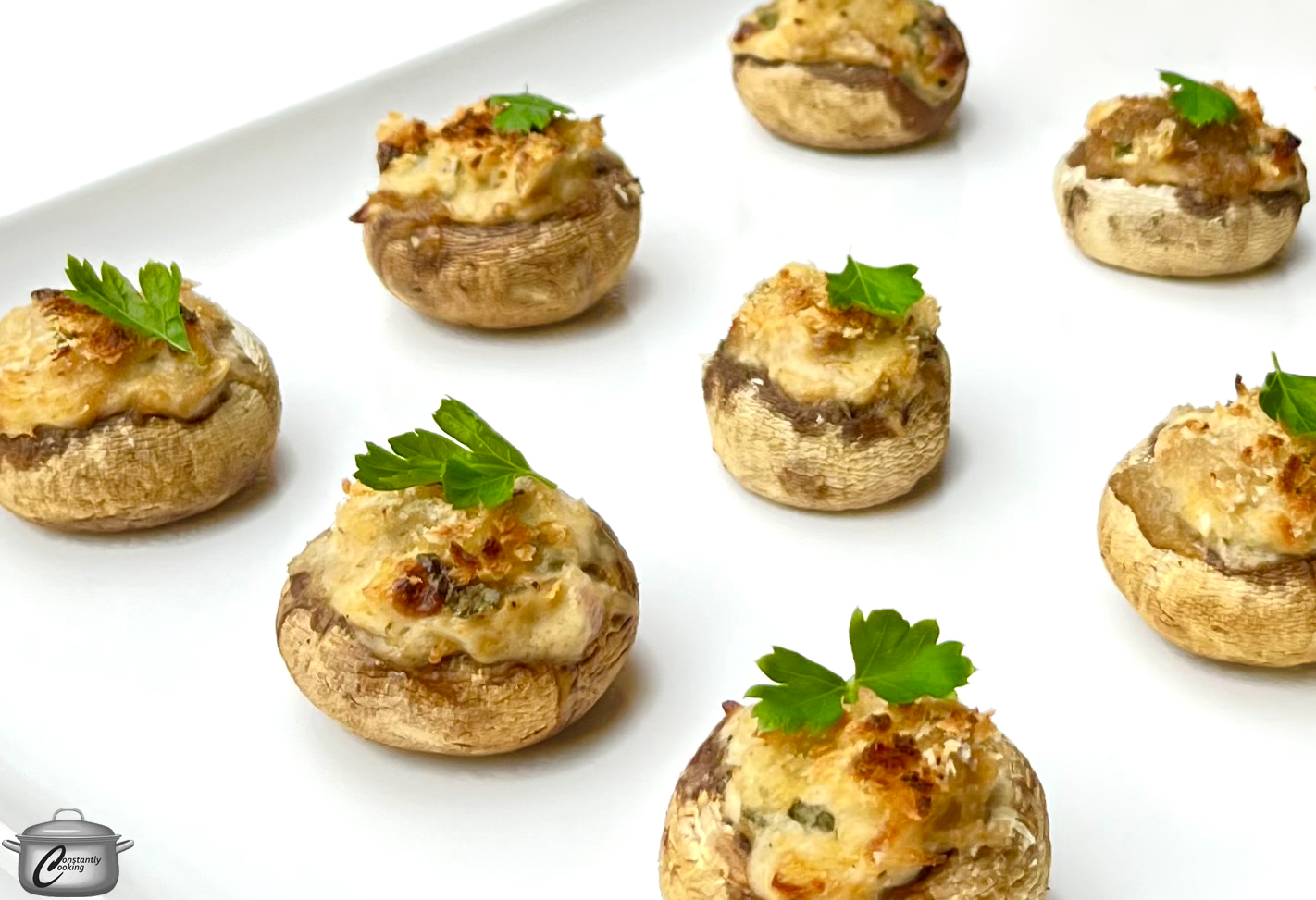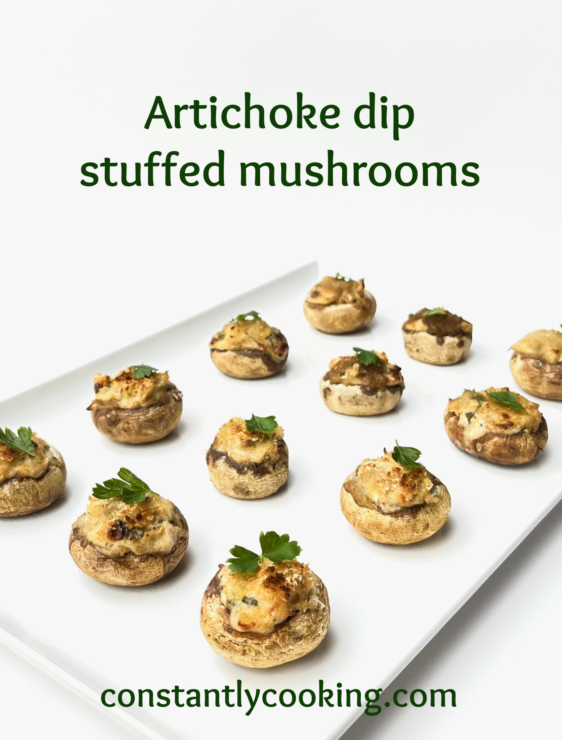 - Just before serving, place the baking sheet in the preheated oven and cook 16 – 18 minutes, until artichoke filling is bubbling and mushrooms have softened.