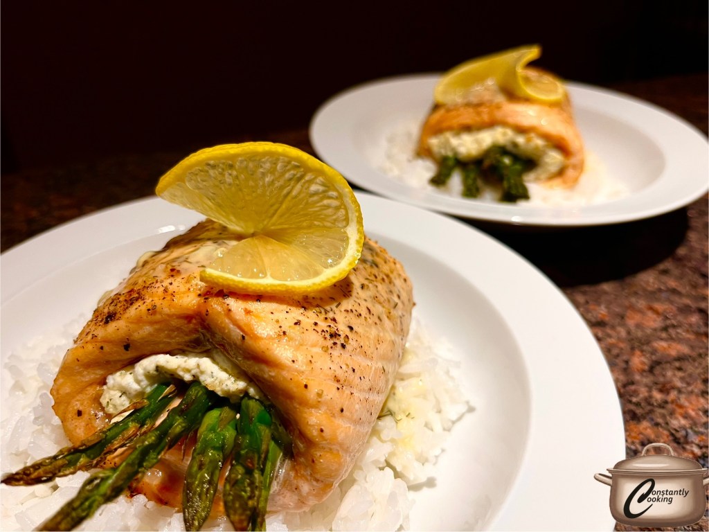 I love dishes that look fancy but are actually pretty easy to prepare and this one fits the bill. Salmon and asparagus are a classic pairing and the dill sauce offers the perfect bright pop of flavour to finish off the dish. We like to enjoy the salmon rolls over hot cooked rice but they would be equally delicious over pasta or mashed potatoes. If you’re a fan of salmon, as I am, you might also enjoy this Niçoise-style roasted salmon and vegetables and this steak spice crusted salmon.