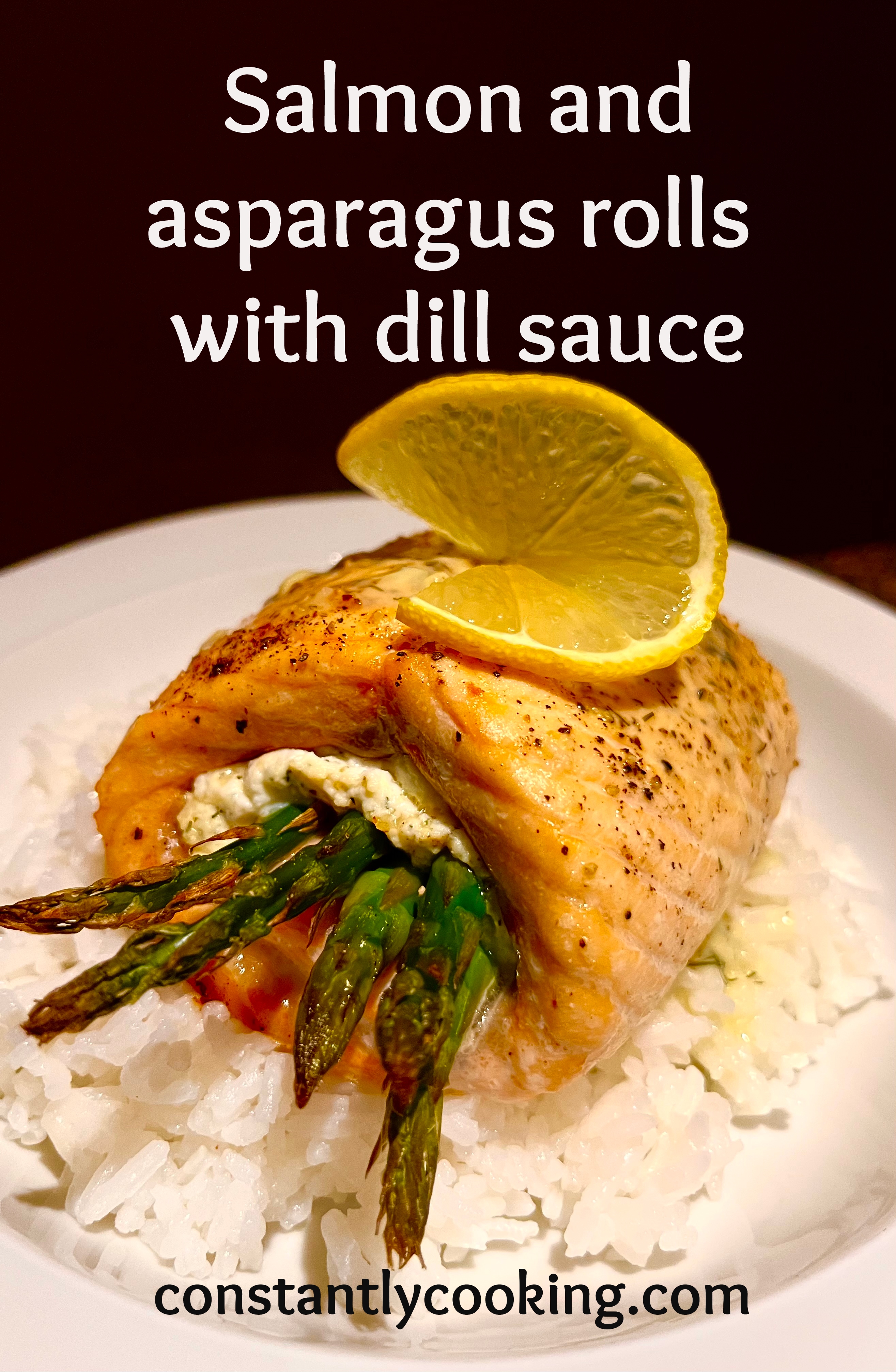 I love dishes that look fancy but are actually pretty easy to prepare and this one fits the bill. Salmon and asparagus are a classic pairing and the dill sauce offers the perfect bright pop of flavour to finish off the dish. We like to enjoy the salmon rolls over hot cooked rice but they would be equally delicious over pasta or mashed potatoes. If you’re a fan of salmon, as I am, you might also enjoy this Niçoise-style roasted salmon and vegetables and this steak spice crusted salmon.