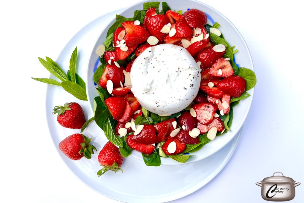 - Scatter nuts, salt and pepper on top and serve, cutting burrata into 4 portions as you serve up the greens and strawberries.