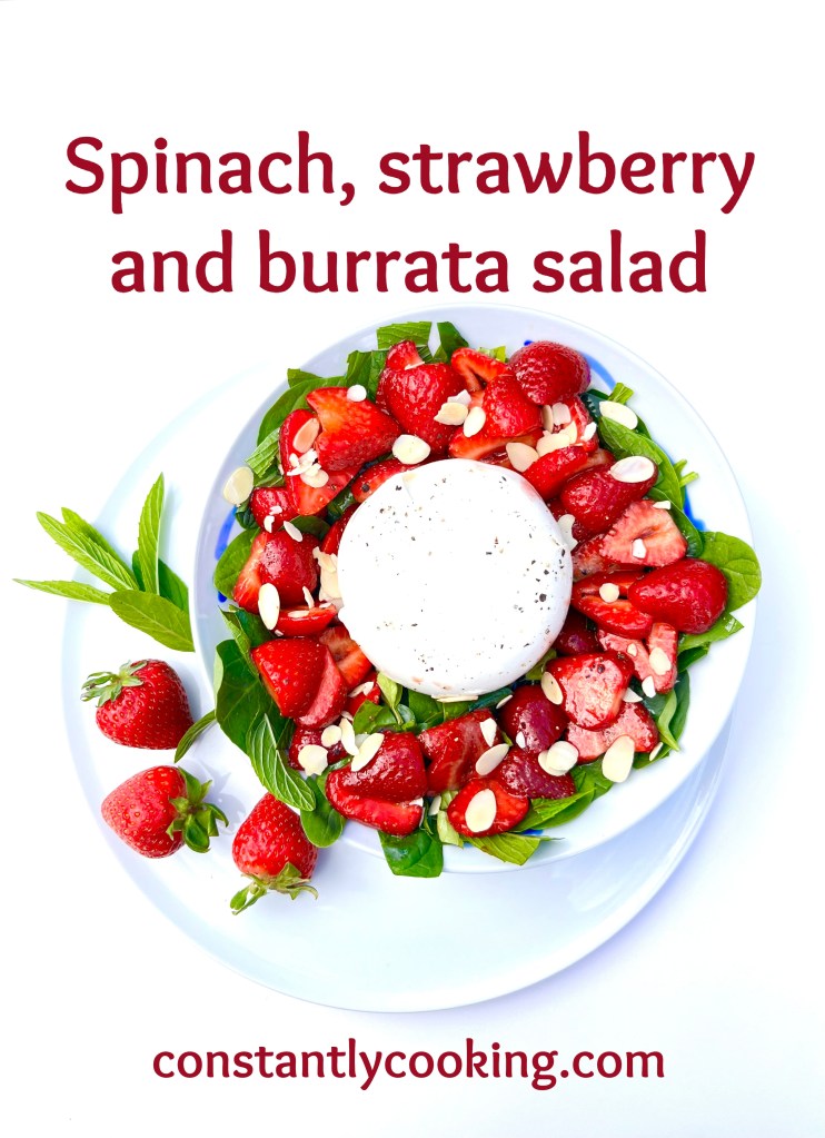 Not only is this simple salad a stunner to serve, it’s delicious and satisfying too. If you’re not familiar with burrata, it is a pouch-like, fresh Italian cheese that has a firm outer layer of mozzarella which surrounds a creamy, spreadable interior consisting of shredded mozzarella stracciatella (cream). They can be hard to find but if you are able to locate baby burrata, you can plate this salad in individual portions with the mini cheese balls as the centrepiece on each plate. If you’re looking for more ways to enjoy this delightful cheese, I highly recommend this pasta recipe with tomatoes, peaches and burrata.
