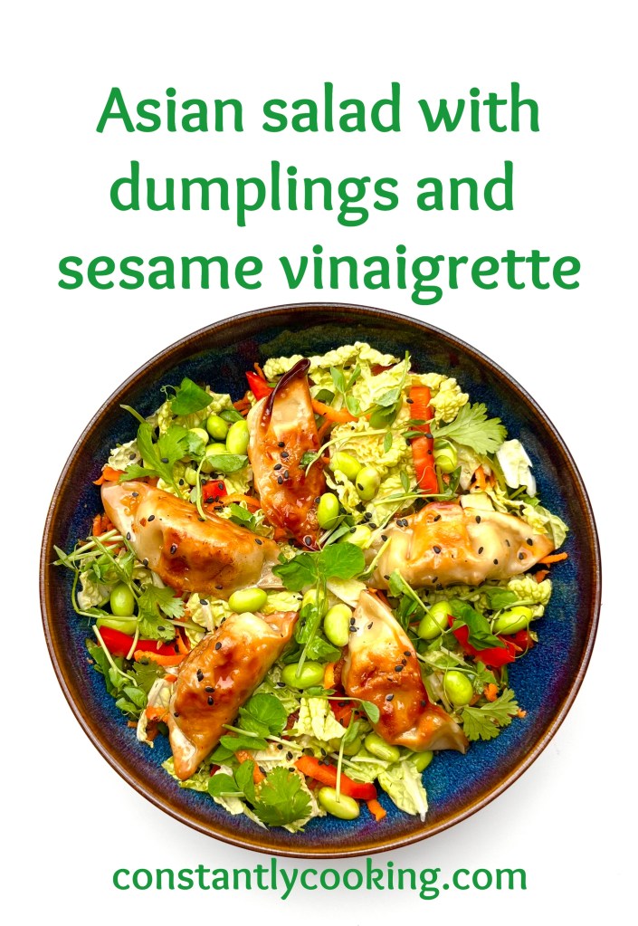 - Divide the dressed vegetables among two broad, shallow serving bowls. Using tongs, place 5 hot dumplings on top of the vegetables in each bowl. Sprinkle with sesame seeds and serve immediately.