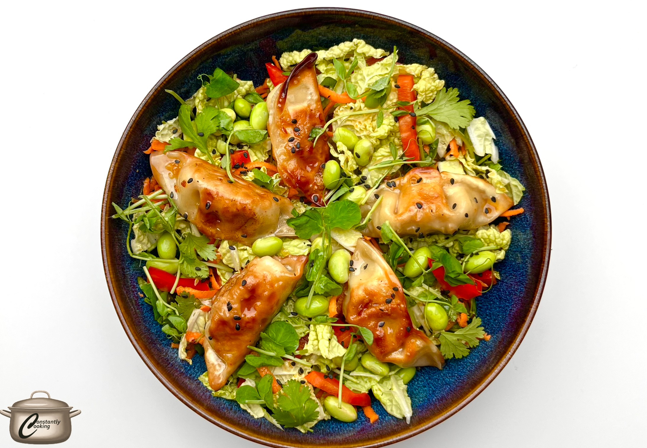 - Divide the dressed vegetables among two broad, shallow serving bowls. Using tongs, place 5 hot dumplings on top of the vegetables in each bowl. Sprinkle with sesame seeds and serve immediately.