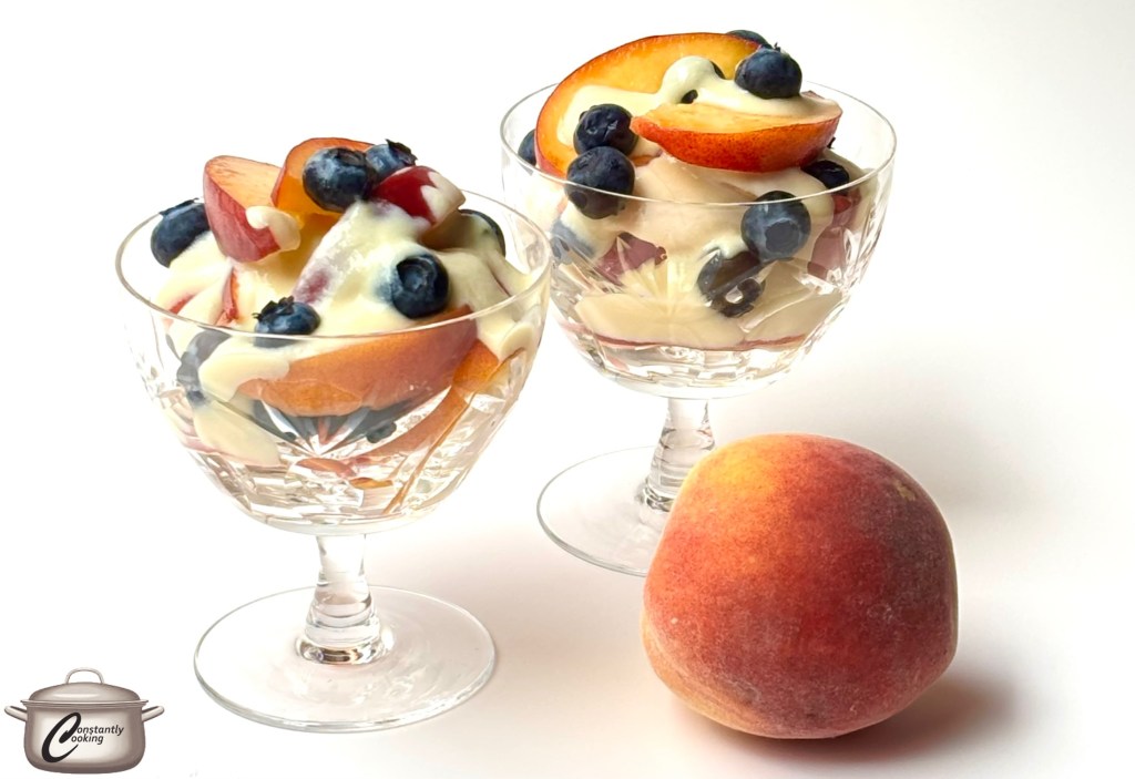 This lovely and easy dessert is the perfect sweet finish for just about any meal. You can use any combination of fruit you like; in summer I always gravitate to fresh peaches and wild blueberries, switching to strawberries, raspberries and/or blackberries when the former are no longer available. I have yet to try it with frozen fruit but I think it would be just as tasty, albeit with a slightly different texture. Because the custard can be made days in advance and the fruit prepped several hours before serving, it’s super quick to serve up this tasty treat and it’s also very portable for picnics. Regardless of the fruit I choose, this dish reminds me most melted ice cream, in the most delicious of ways.