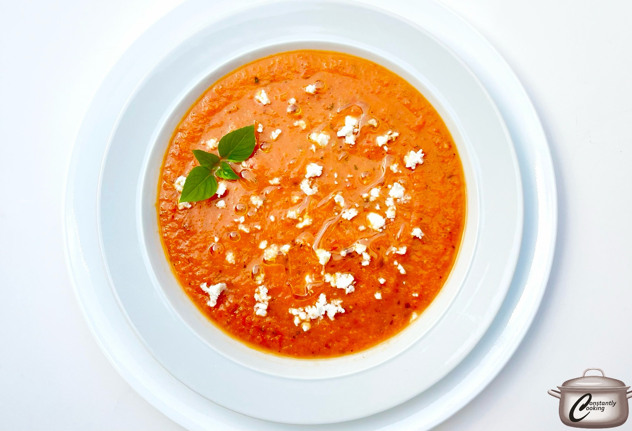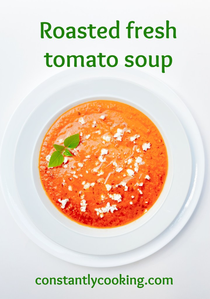 I’m sure I’m not alone in this predicament: I wait months for the tomatoes in my garden to grow and then, all of a sudden, I am overwhelmed by the plants’ abundance. I picked a huge basket of perfectly ripe fruit the other day and realized there were only so many sandwiches and salads I could eat, so I decided to roast some tomatoes and make this soup. I loved it and my husband absolutely raved about the flavour; I’ll be making this one often. If you’re wondering about the inclusion of baking soda, it helps neutralize the tomatoes’ natural acidity and really enhances the flavour. This soup freezes well; I plan to make numerous batches to set aside for a taste of summer on cold winter days. It can be enjoyed warm, at room temperature or cold.
