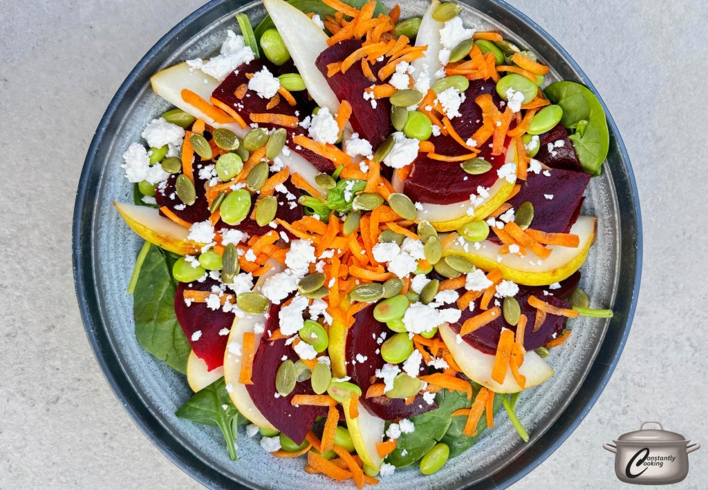 - Also while beets are roasting, cook the edamame for 4 minutes in boiling water. Drain well and set aside to cool.