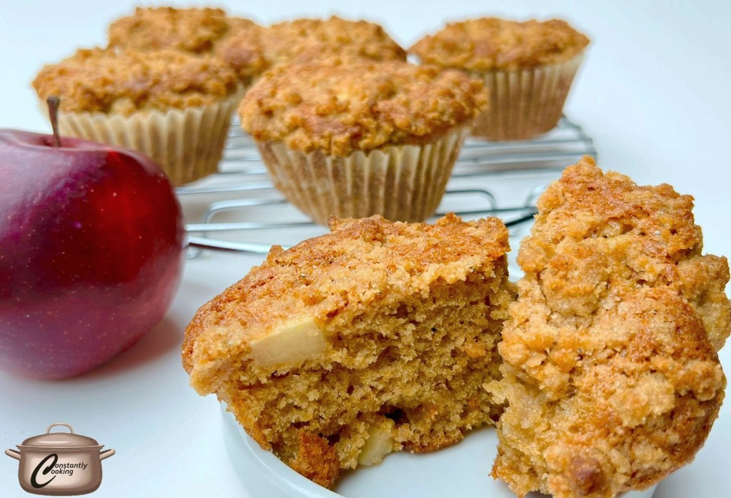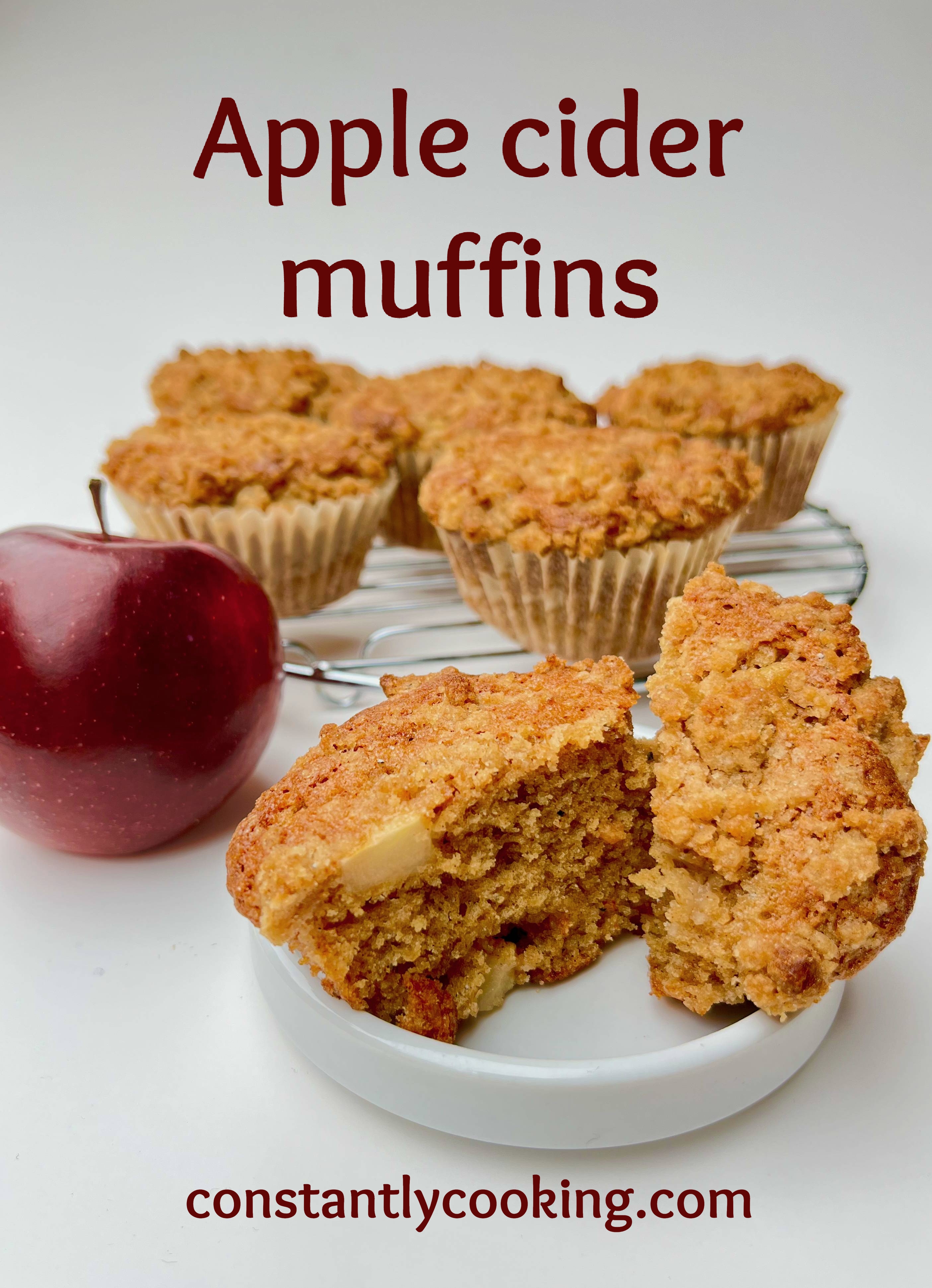 I adore making and eating muffins and while I have oodles of fantastic recipes already, somehow I keep coming up with new ideas. This latest version was inspired by a big jug of cider purchased at a local orchard, along with some crisp new apples. The cider’s intended first use was these fabulous baked apple cider doughnuts but in the end, testing my new recipe for these muffins took priority and I’m glad it did. Note that virtually any muffin batter can be frozen before baking; simply scoop into the paper-lined muffin pan and pop in the freezer; after 2 hours (or whenever frozen solid), transfer to an airtight container for up to 3 months. Remove from freezer to thaw slightly while oven preheats and add about two minutes to the baking time. Note that you can use non-dairy substitutes for the butter and sour cream, if you prefer.
